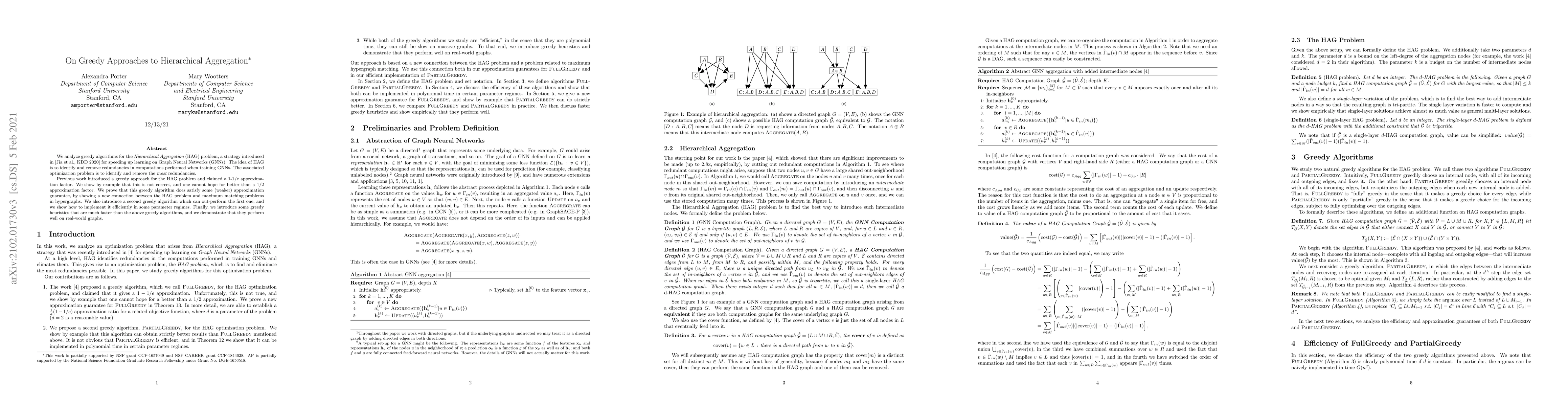 We analyze greedy algorithms for the Hierarchical Aggregation (HAG) problem, a strategy introduced in [Jia et al., KDD 2020] for speeding up learning on Graph Neural Networks (GNNs). The idea of HAG is to identify and remove redundancies in computations performed when training GNNs. The associated optimization problem is to identify and remove the most redundancies. Previous work introduced a greedy approach for the HAG problem and claimed a 1-1/e approximation factor. We show by example that this is not correct, and one cannot hope for better than a 1/2 approximation factor. We prove that this greedy algorithm does satisfy some (weaker) approximation guarantee, by showing a new connection between the HAG problem and maximum matching problems in hypergraphs. We also introduce a second greedy algorithm which can out-perform the first one, and we show how to implement it efficiently in some parameter regimes. Finally, we introduce some greedy heuristics that are much faster than the above greedy algorithms, and we demonstrate that they perform well on real-world graphs.