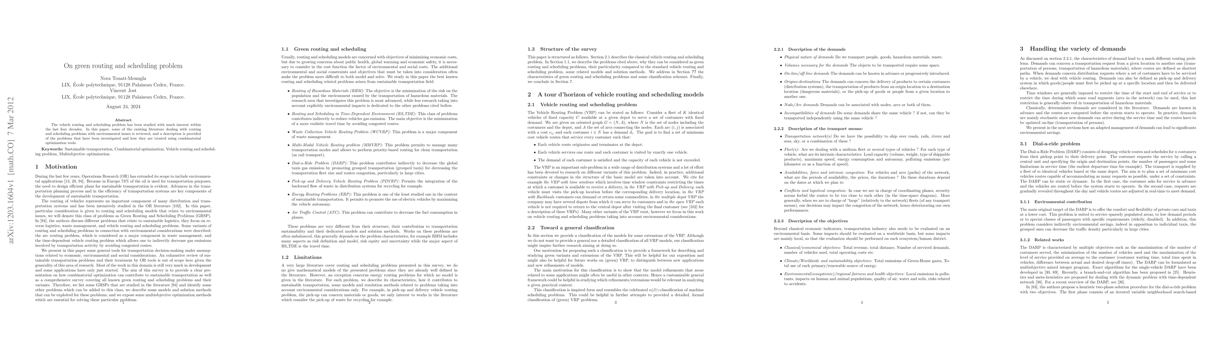 Summary: This paper reviews literature on vehicle routing and scheduling problems incorporating environmental concerns, detailing the issues addressed and their solutions through combinatorial optimization techniques.