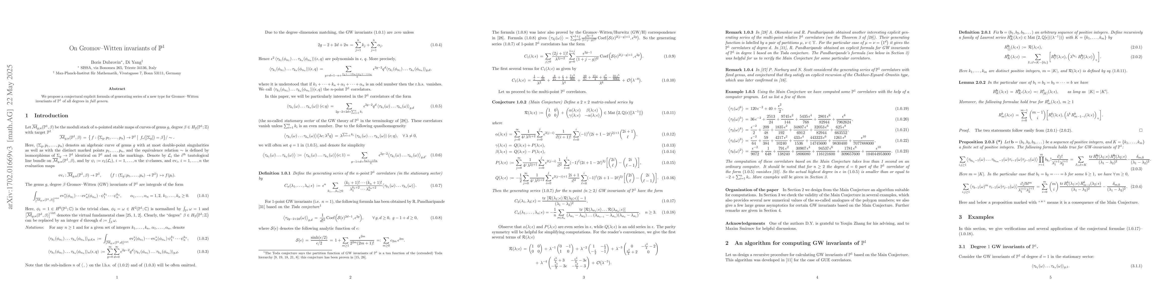 Summary: This paper proposes a conjectural explicit formula for generating series of a novel type of Gromov--Witten invariants of $\mathbb{P}^1$ across all degrees and genera. The conjecture aims to provide a comprehensive understanding of these invariants.