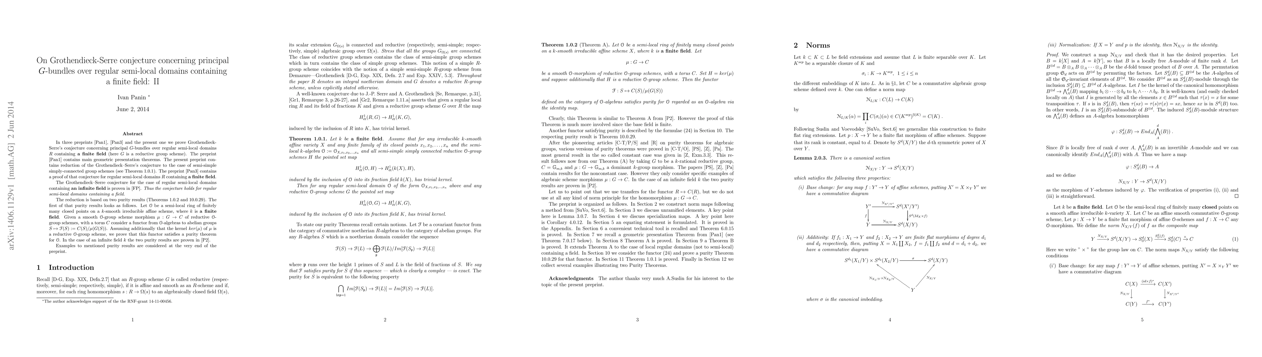 In three preprints [Pan1], [Pan3] and the present one we prove Grothendieck-Serre's conjecture concerning principal G-bundles over regular semi-local domains R containing a finite field (here $G$ is a reductive group scheme). The preprint [Pan1] contains main geometric presentation theorems which are necessary for that. The present preprint contains reduction of the Grothendieck--Serre's conjecture to the case of semi-simple simply-connected group schemes (see Theorem 1.0.1). The preprint [Pan3] contains a proof of that conjecture for regular semi-local domains R containing a finite field. The Grothendieck--Serre conjecture for the case of regular semi-local domains containing an infinite field is proven in joint work due to R.Fedorov and I.Panin (see [FP]). Thus the conjecture holds for regular semi-local domains containing a field. The reduction is based on two purity results (Theorem 1.0.2 and Theorem 10.0.29).