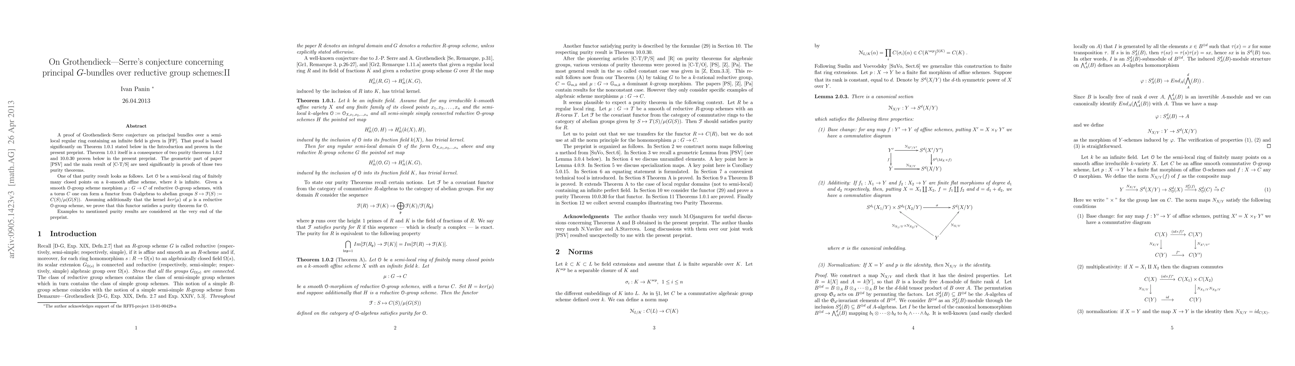 This paper proves the Grothendieck--Serre conjecture on principal bundles over a semi-local regular ring containing an infinite field, building on Theorem 1.0.1 derived from two purity theorems. It uses geometric results from another preprint and a key result from an existing article to establish these purity theorems, ultimately demonstrating a purity property for a functor formed from reductive O-group schemes.