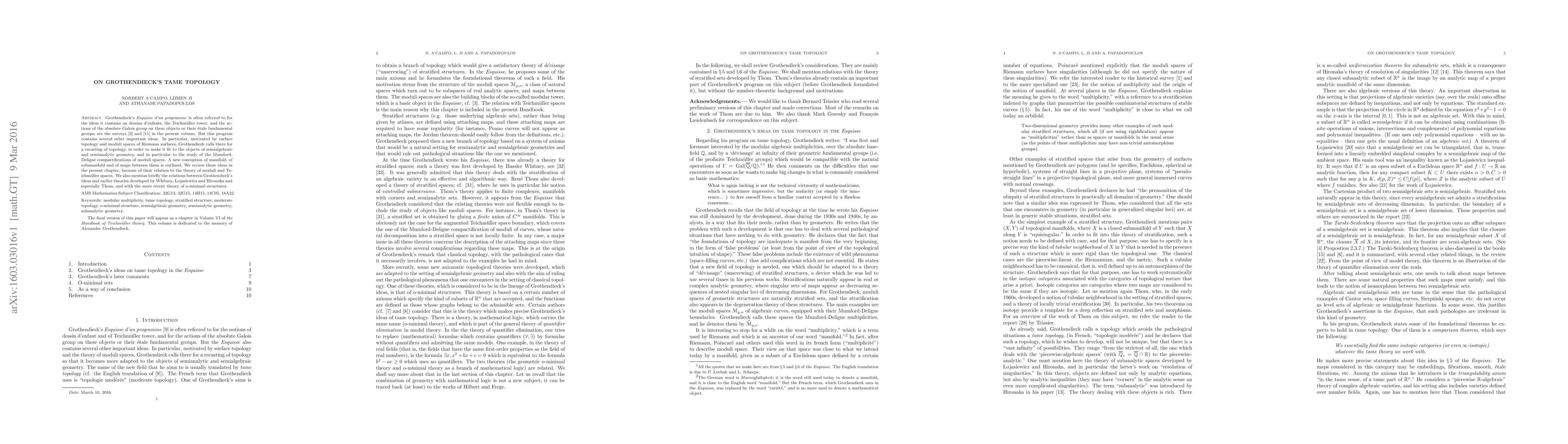 Grothendieck's Esquisse d'un programme is often referred to for the ideas it contains on dessins d'enfants, the Teichm{\"u}ller tower, and the actions of the absolute Galois group on these objects or their etale fundamental groups. But this program contains several other important ideas. In particular, motivated by surface topology and moduli spaces of Riemann surfaces, Grothendieck calls there for a recasting of topology, in order to make it fit to the objects of semialgebraic and semianalytic geometry, and in particular to the study of the Mumford-Deligne compactifications of moduli spaces. A new conception of manifold, of submanifold and of maps between them is outlined. We review these ideas in the present chapter, because of their relation to the theory of moduli and Te-ichm{\"u}ller spaces. We also mention briefly the relations between Grothendieck's ideas and earlier theories developed by Whitney, Lojasiewicz and Hironaka and especially Thom, and with the more recent theory of o-minimal structures. The final version of this paper will appear as a chapter in Volume VI of the Handbook of Teichm{\"u}ller theory. This volume is dedicated to the memory of Alexander Grothendieck.