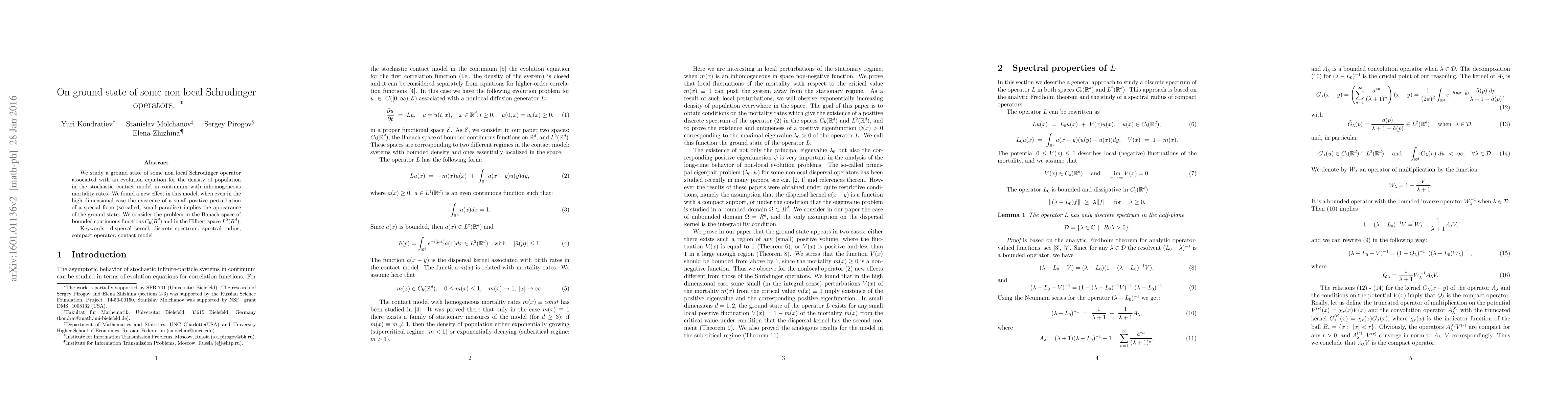 We study a ground state of a non local Schrodinger operator associated with an evolution equation for the density of population in the stochastic contact model in continuum with inhomogeneous mortality rates. We found a new effect in this model, when even in the high dimensional case the existence of a small positive perturbation of a special form (so-called, small paradise) implies the appearance of the ground state. We consider the problem in the Banach space of bounded continuous functions $C_b (R^d)$ and in the Hilbert space $L^2(R^d)$.