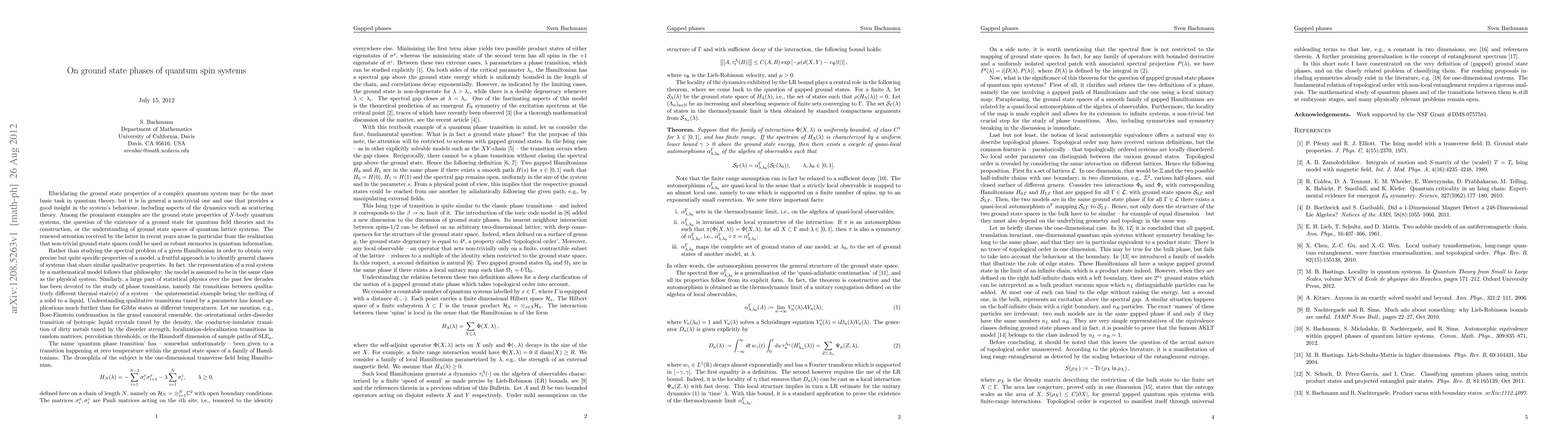 Summary: This paper reviews recent findings on gapped ground state phases of quantum spin systems, emphasizing the concept of topological order and its implications for understanding the underlying quantum phases.