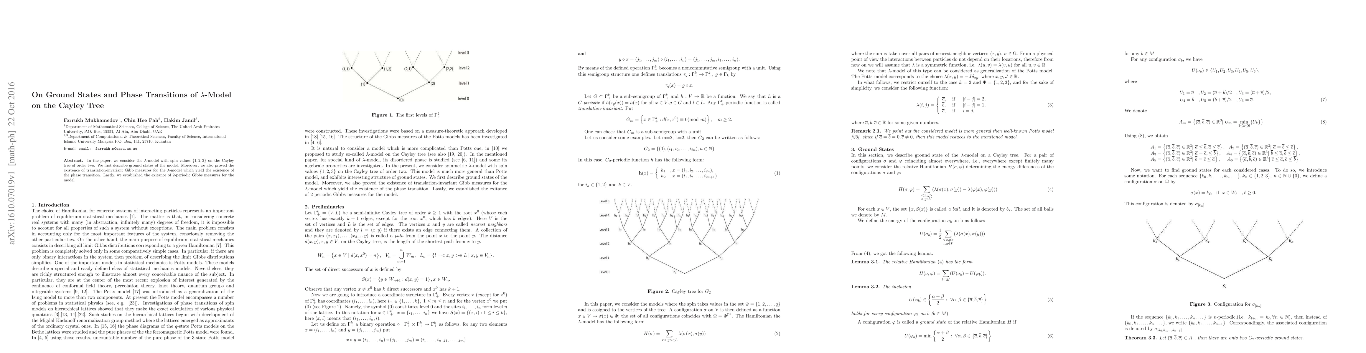 Researchers studied a specific model on the Cayley tree, showing that it has ground states and phase transitions, with the existence of certain types of measures enabling these phenomena. The study provides insights into the model's behavior and its potential applications in statistical mechanics.