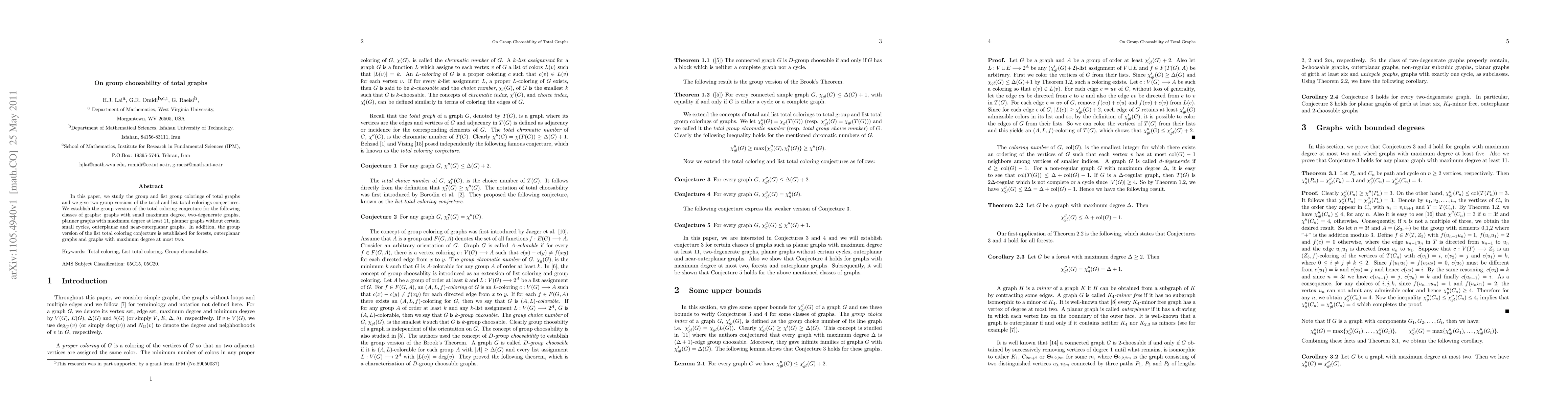 This paper explores group and list group colorings of total graphs, establishing the group version of the total coloring conjecture for specific classes of graphs and the list total coloring conjecture for forests, outerplanar graphs, and low-degree graphs.