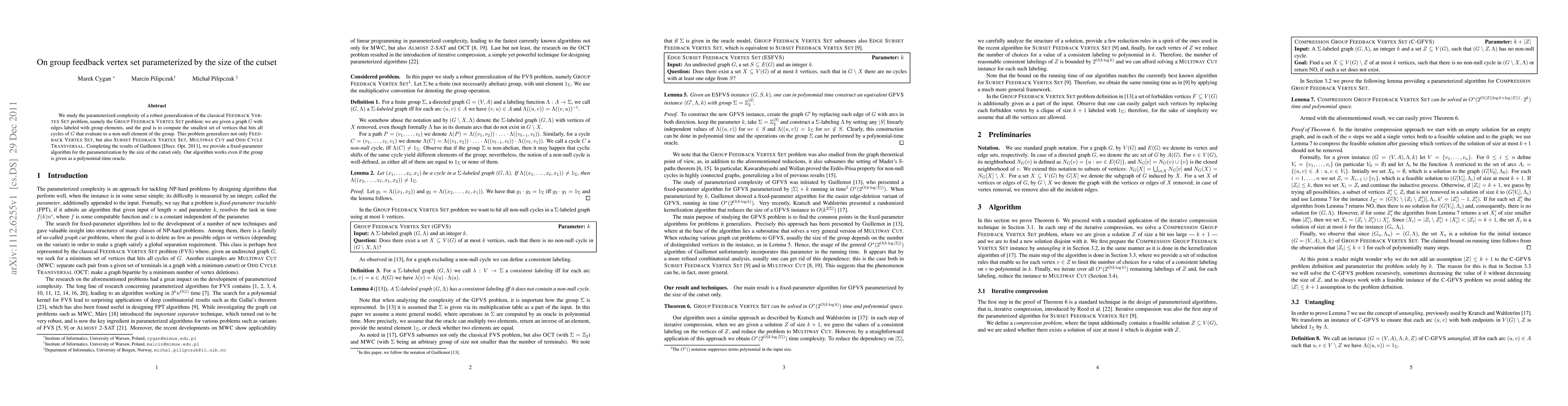 This paper studies the parameterized complexity of the Group Feedback Vertex Set problem, providing a fixed-parameter algorithm that solves it when parameterized by the size of the cutset. The algorithm works even when the group operations are performed via a polynomial-time oracle.