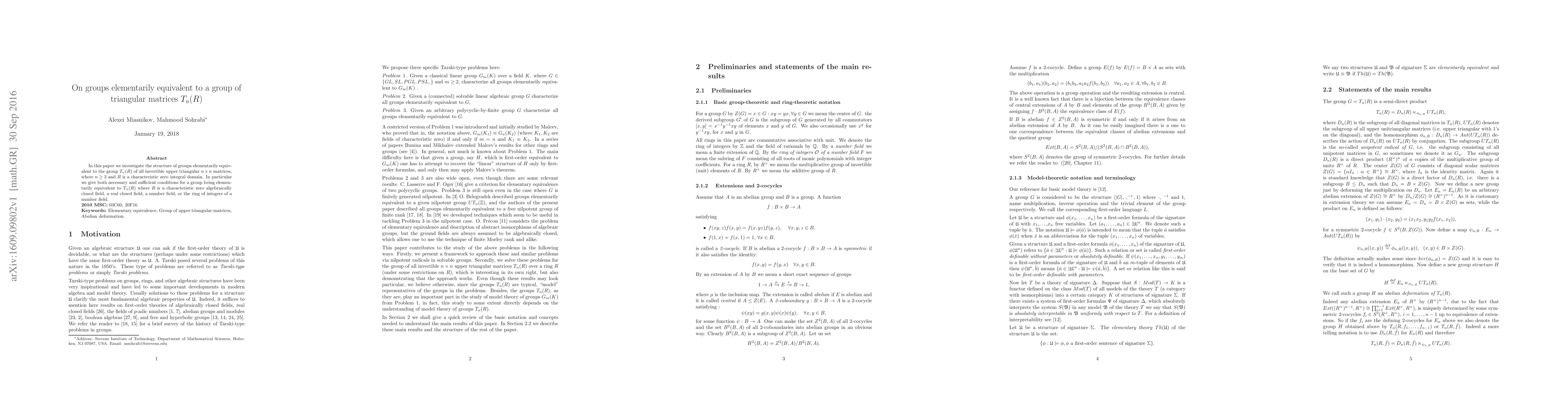 This paper investigates groups elementarily equivalent to $T_n(R)$ of triangular matrices, providing conditions for equivalence with characteristic zero fields and integral domains.