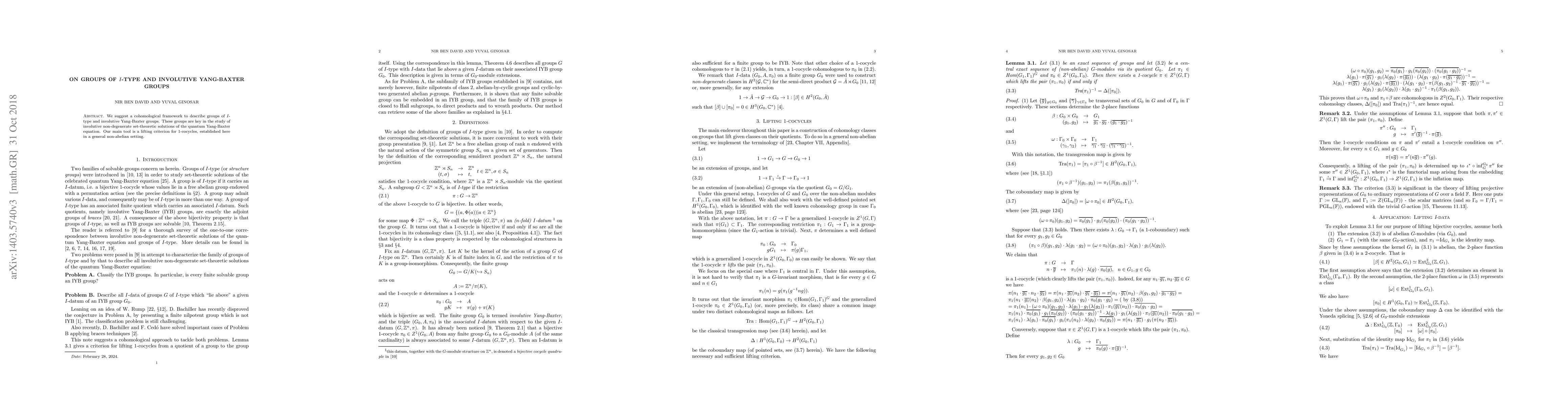 This paper proposes a cohomological framework to analyze groups of $I$-type and involutive Yang-Baxter groups, crucial for understanding quantum solutions of the Yang-Baxter equation, utilizing a new lifting criterion for 1-cocycles in a non-abelian context.
