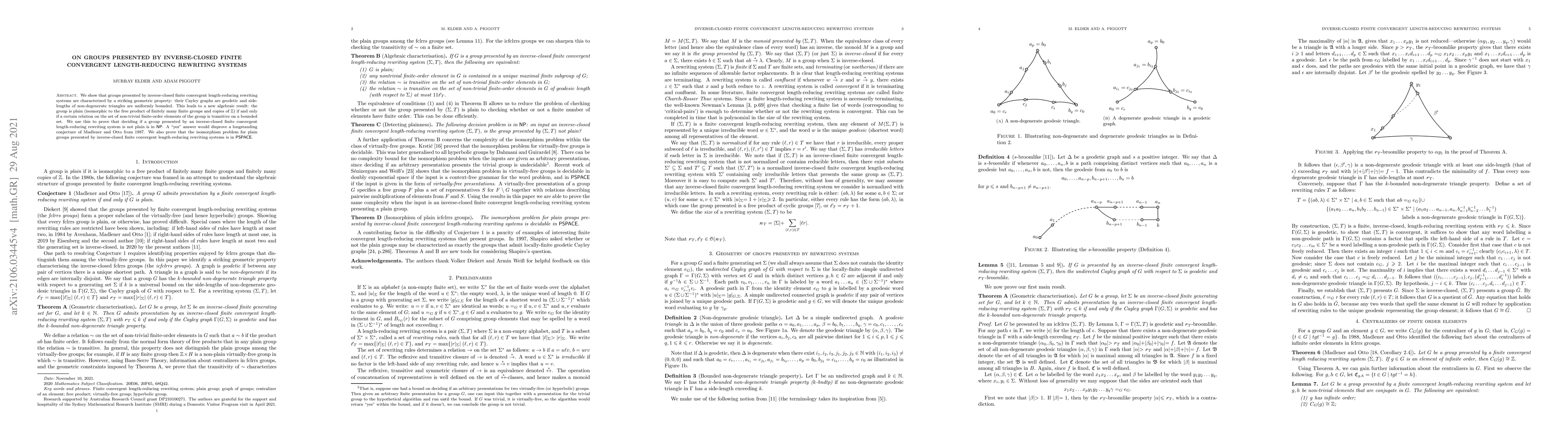 We show that groups presented by inverse-closed finite convergent length-reducing rewriting systems are characterised by a striking geometric property: their Cayley graphs are geodetic and side-lengths of non-degenerate triangles are uniformly bounded. This leads to a new algebraic result: the group is plain (isomorphic to the free product of finitely many finite groups and copies of $\mathbb Z$) if and only if a certain relation on the set of non-trivial finite-order elements of the group is transitive on a bounded set. We use this to prove that deciding if a group presented by an inverse-closed finite convergent length-reducing rewriting system is not plain is in $\mathsf{NP}$. A "yes" answer would disprove a longstanding conjecture of Madlener and Otto from 1987. We also prove that the isomorphism problem for plain groups presented by inverse-closed finite convergent length-reducing rewriting systems is in $\mathsf{PSPACE}$.