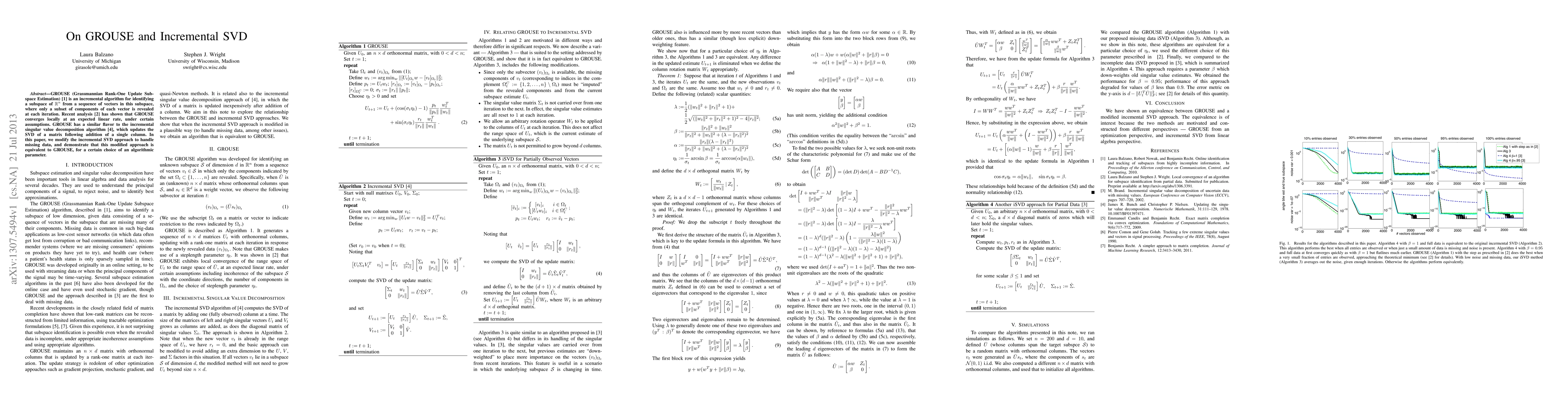 Researchers modify incremental singular value decomposition to handle missing data, showing it is equivalent to GROUSE for a certain choice of parameter, with the modified approach converging at an expected linear rate.