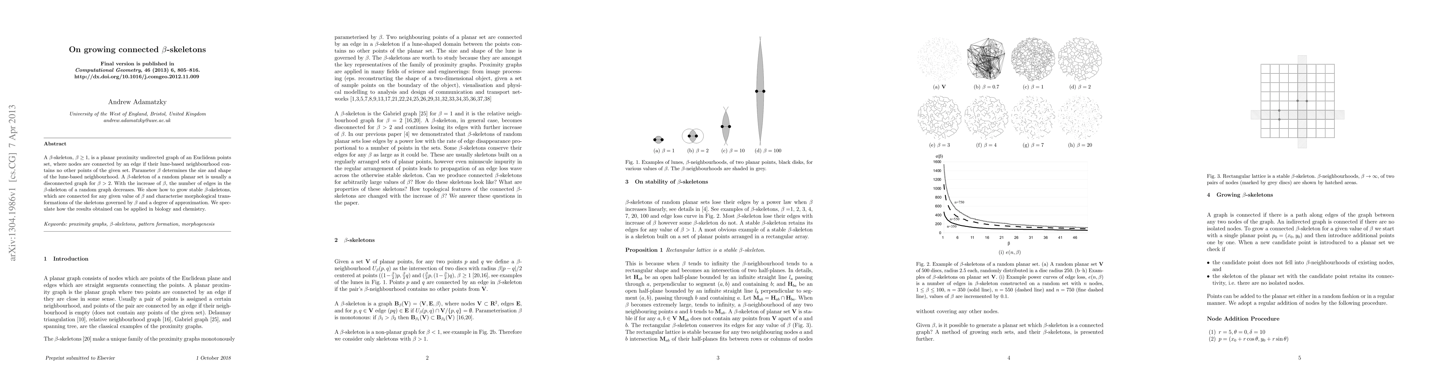 A $\beta$-skeleton, $\beta \geq 1$, is a planar proximity undirected graph of an Euclidean points set, where nodes are connected by an edge if their lune-based neighbourhood contains no other points of the given set. Parameter $\beta$ determines the size and shape of the lune-based neighbourhood. A $\beta$-skeleton of a random planar set is usually a disconnected graph for $\beta>2$. With the increase of $\beta$, the number of edges in the $\beta$-skeleton of a random graph decreases. We show how to grow stable $\beta$-skeletons, which are connected for any given value of $\beta$ and characterise morphological transformations of the skeletons governed by $\beta$ and a degree of approximation. We speculate how the results obtained can be applied in biology and chemistry.