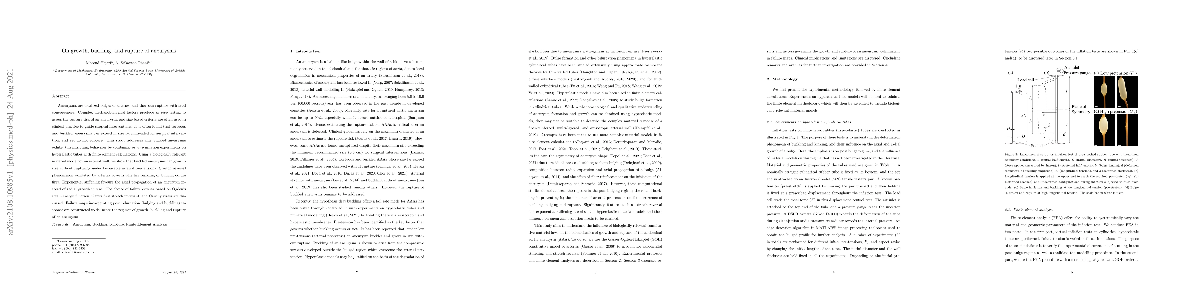 This study combines in vitro experiments and finite element analysis to explore why buckled aneurysms, despite exceeding recommended surgical size, often do not rupture. The research reveals that favorable arterial pre-tensions and stretch reversal phenomena allow buckled aneurysms to grow without rupturing, governed by exponential stiffening and different failure criteria.