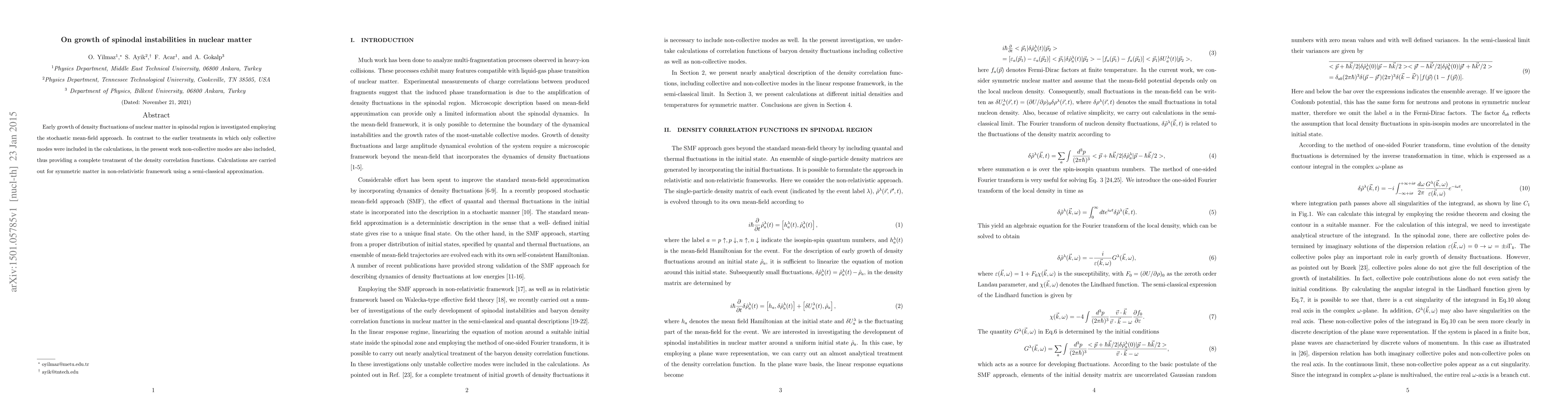 This paper investigates the early growth of density fluctuations in nuclear matter within the spinodal region using a stochastic mean-field approach that includes both collective and non-collective modes, providing a comprehensive treatment of density correlation functions. Calculations are performed for symmetric matter under a non-relativistic semi-classical approximation.