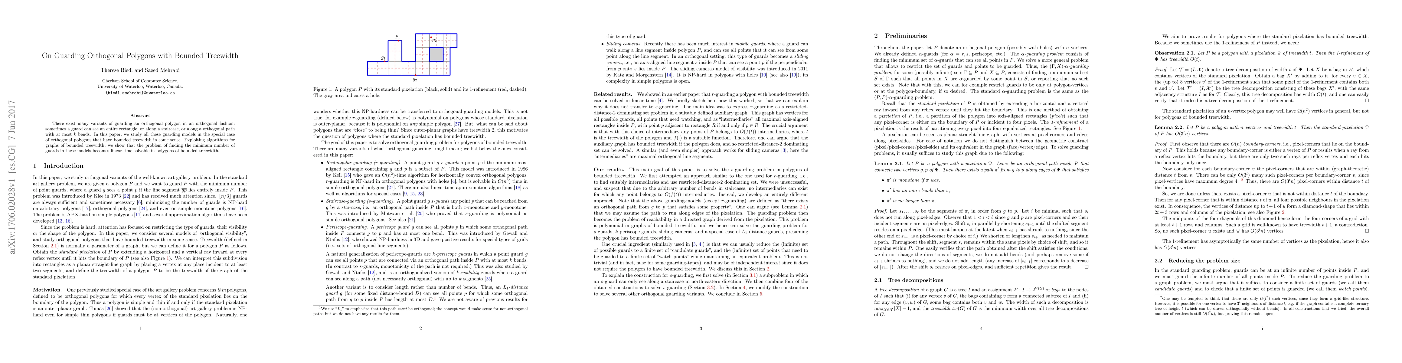 This paper investigates various models of guarding orthogonal polygons, focusing on those with bounded treewidth. It demonstrates that using algorithms for graphs with bounded treewidth, the problem of determining the minimum number of guards can be solved in linear time for these polygons.