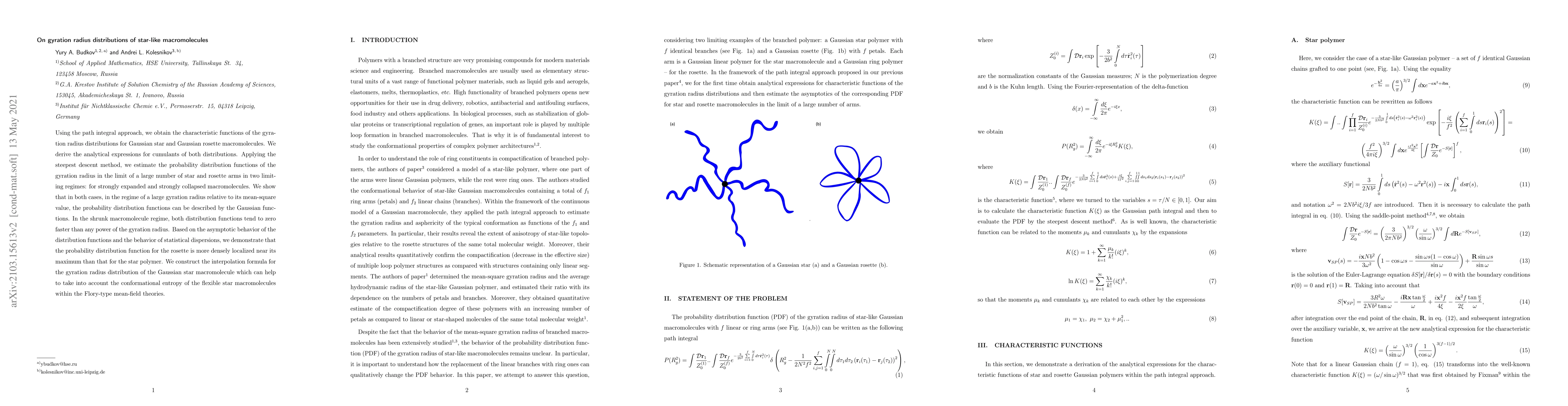 The research used a path integral approach to calculate the characteristic functions of gyration radius distributions for Gaussian star and rosette polymers.