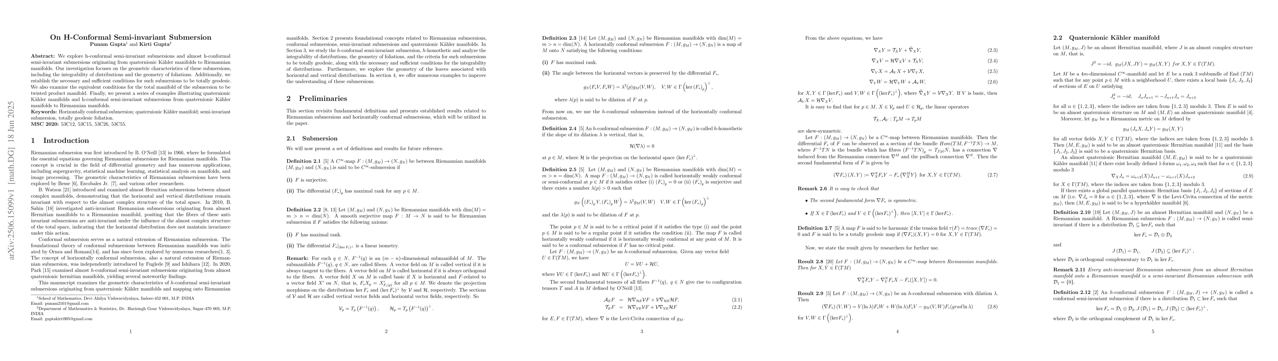 We explore h-conformal semi-invariant submersions and almost h-conformal semi-invariant submersions originating from quaternionic K\"ahler manifolds to Riemannian manifolds. Our investigation focuses on the geometric characteristics of these submersions, including the integrability of distributions and the geometry of foliations. Additionally, we establish the necessary and sufficient conditions for such submersions to be totally geodesic. We also examine the equivalent conditions for the total manifold of the submersion to be twisted product manifold. Finally, we present a series of examples illustrating quaternionic K\"ahler manifolds and h-conformal semi-invariant submersions from quaternionic K\"ahler manifolds to Riemannian manifolds.