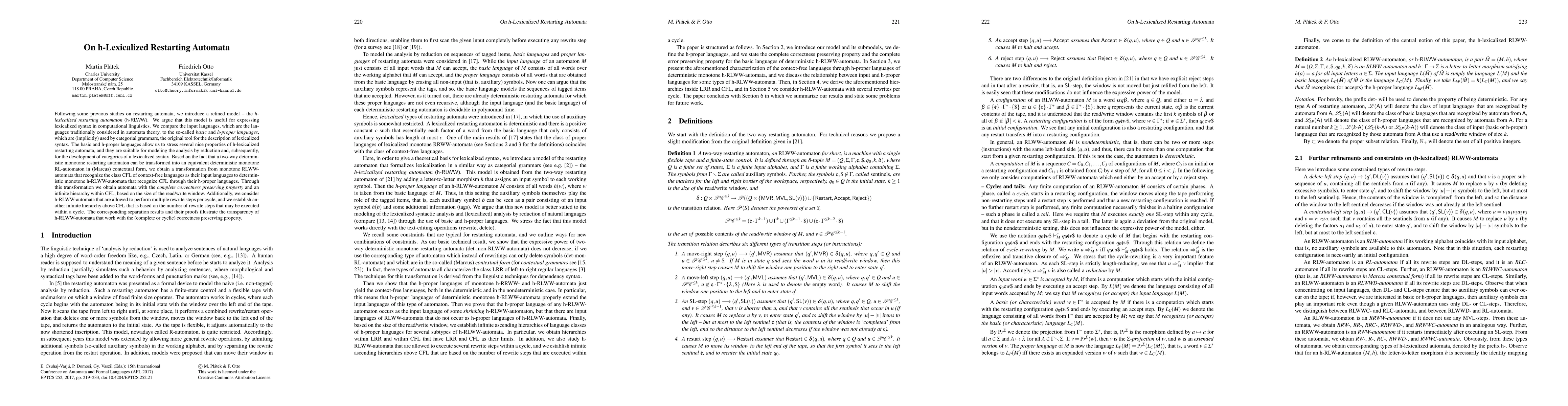 This paper introduces h-lexicalized restarting automata (h-RLWW) for expressing lexicalized syntax in computational linguistics. It compares traditional input languages to basic and h-proper languages, demonstrating h-RLWW's advantages. The study transforms monotone RLWW-automata into deterministic monotone h-RLWW-automata, preserving correctness and creating hierarchies within CFL based on read/write window size and rewrite steps per cycle.