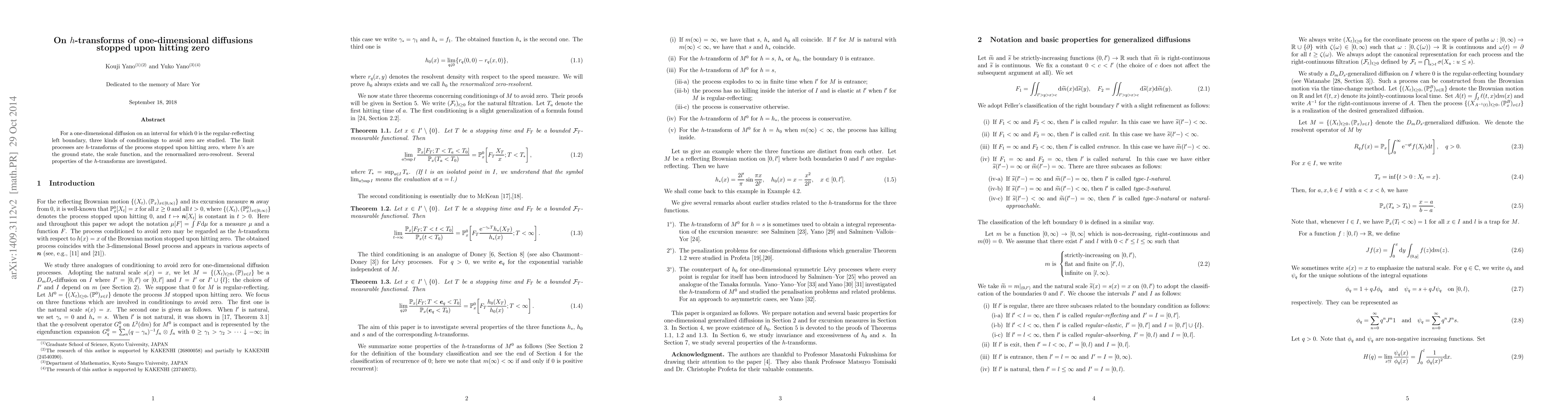 This paper studies three types of conditionings for a one-dimensional diffusion to avoid hitting zero, resulting in $h$-transforms of the process stopped at zero. The $h$'s considered are the ground state, scale function, and renormalized zero-resolvent, with properties of these transformations investigated.