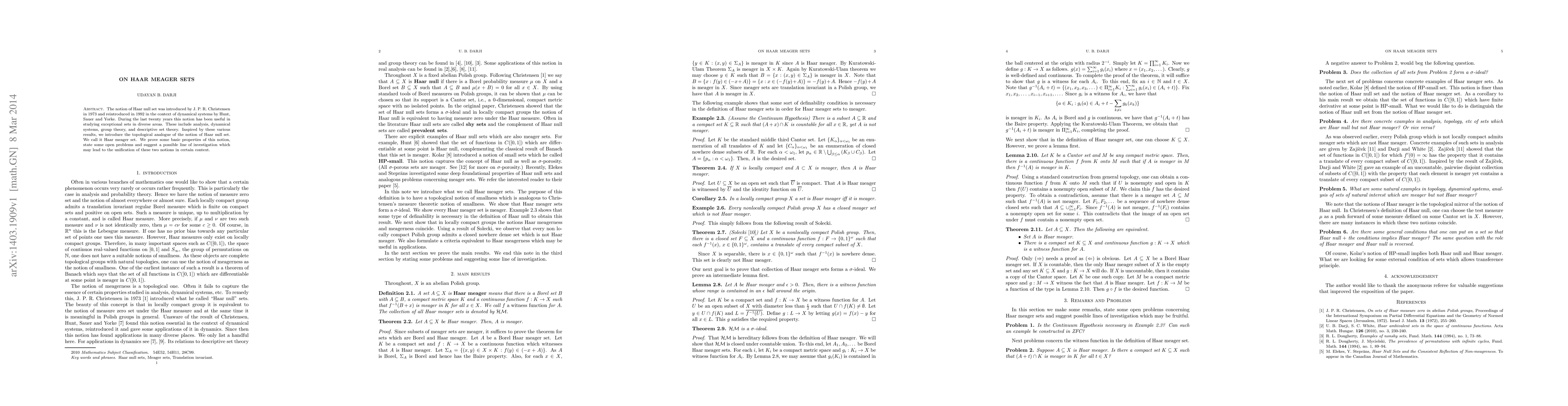 This paper introduces the concept of Haar meager sets as a topological analogue of Haar null sets, proving basic properties and suggesting potential research directions that may unify the two notions across various mathematical fields. Open problems and future investigation avenues are also discussed.