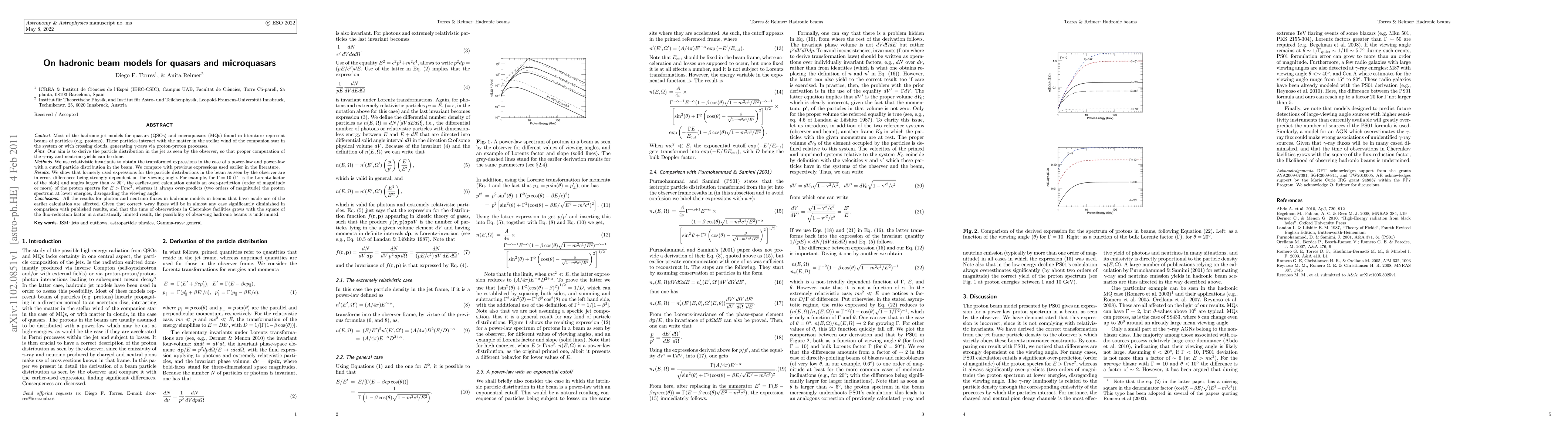 Most of the hadronic jet models for quasars (QSOs) and microquasars (MQs) found in literature represent beams of particles (e.g. protons). These particles interact with the matter in the stellar wind of the companion star in the system or with crossing clouds, generating gamma-rays via proton-proton processes. Our aim is to derive the particle distribution in the jet as seen by the observer, so that proper computation of the $\gamma$-ray and neutrino yields can be done. We use relativistic invariants to obtain the transformed expressions in the case of a power-law and power-law with a cutoff particle distribution in the beam. We compare with previous expressions used earlier in the literature. We show that formerly used expressions for the particle distributions in the beam as seen by the observer are in error, differences being strongly dependent on the viewing angle. For example, for $\Gamma =10$ ($\Gamma$ is the Lorentz factor of the blob) and angles larger than $\sim 20^o$, the earlier-used calculation entails an over-prediction (order of magnitude or more) of the proton spectra for $E>\Gamma mc^2$, whereas it always over-predicts (two orders of magnitude) the proton spectrum at lower energies, disregarding the viewing angle. All the results for photon and neutrino fluxes in hadronic models in beams that have made use of the earlier calculation are affected. Given that correct gamma-ray fluxes will be in almost any case significantly diminished in comparison with published results, and that the time of observations in Cherenkov facilities grows with the square of the flux-reduction factor in a statistically limited result, the possibility of observing hadronic beams is undermined.