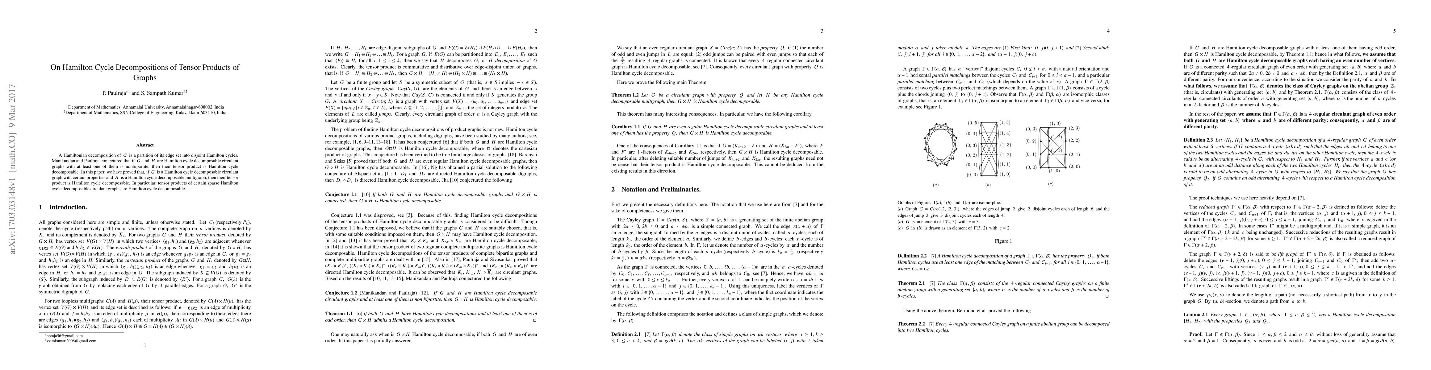 This paper proves that the tensor product of a Hamilton cycle decomposable circulant graph with certain properties and a Hamilton cycle decomposable multigraph is also Hamilton cycle decomposable, supporting a conjecture by Manikandan and Paulraja. It specifically addresses sparse Hamilton cycle decomposable circulant graphs.