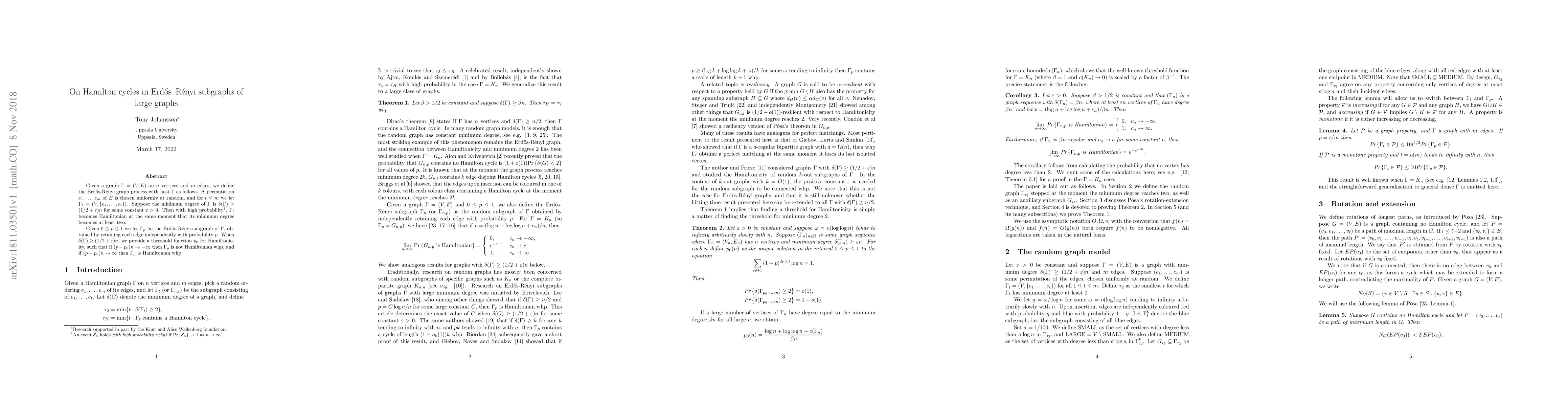 This paper investigates Hamilton cycles in Erdős-Rényi subgraphs of large graphs. It establishes a threshold function for Hamiltonicity when the original graph has a sufficiently high minimum degree, showing that the subgraph is likely to be Hamiltonian if the edge retention probability exceeds this threshold.