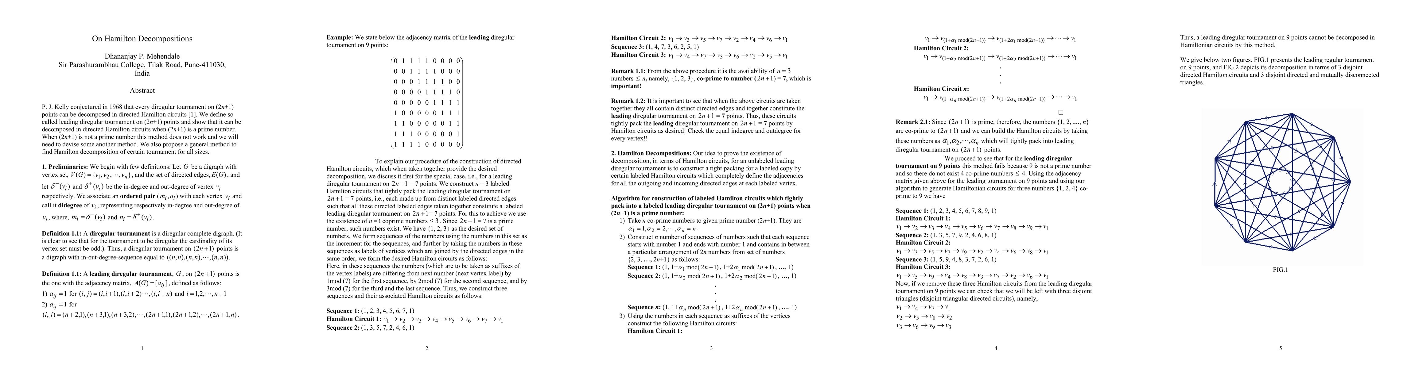 P. J. Kelly conjectured in 1968 that every diregular tournament on (2n+1) points can be decomposed in directed Hamilton circuits [1]. We define so called leading diregular tournament on (2n+1) points and show that it can be decomposed in directed Hamilton circuits when (2n+1) is a prime number. When (2n+1) is not a prime number this method does not work and we will need to devise some another method. We also propose a general method to find Hamilton decomposition of certain tournament for all sizes.