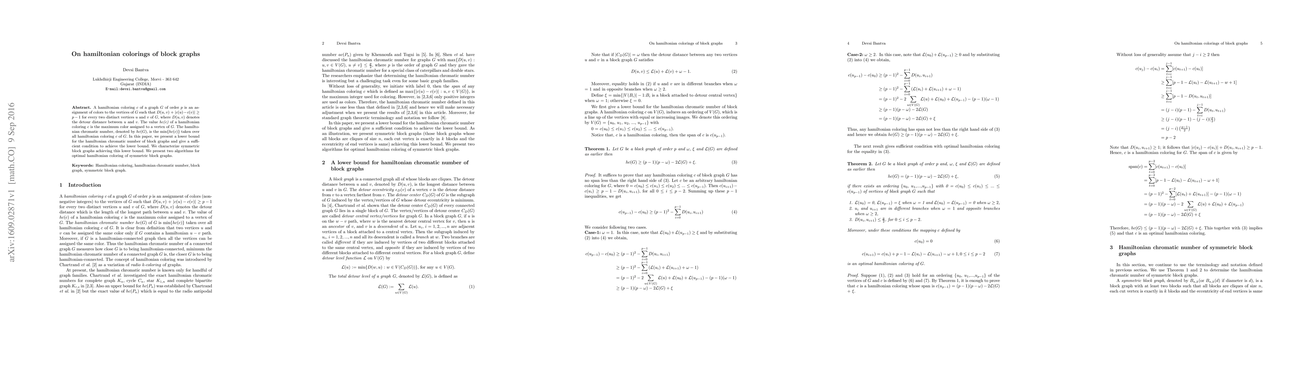 A hamiltonian coloring c of a graph G of order p is an assignment of colors to the vertices of G such that $D(u,v)+|c(u)-c(v)|\geq p-1$ for every two distinct vertices u and v of G, where D(u,v) denoted the detour distance between u and v. The value hc(c) of a hamiltonian coloring c is the maximum color assigned to a vertex of G. The hamiltonian chromatic number, denoted by hc(G), is the min{hc(c)} taken over all hamiltonian coloring c of G. In this paper, we present a lower bound for the hamiltonian chromatic number of block graphs and give a sufficient condition to achieve the lower bound. We characterize symmetric block graphs achieving this lower bound. We present two algorithms for optimal hamiltonian coloring of symmetric block graphs.