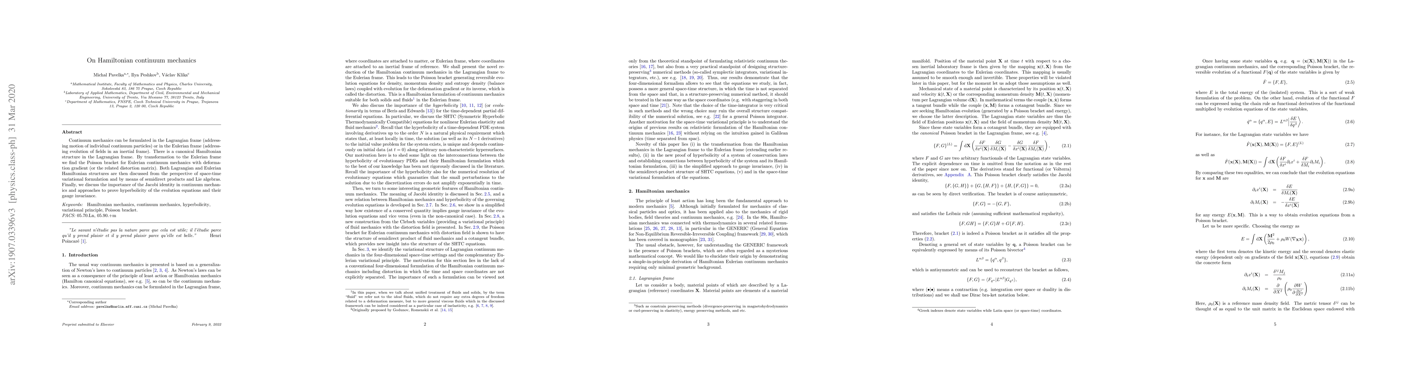 This paper explores the Hamiltonian formulation of continuum mechanics in both Lagrangian and Eulerian frames, establishing a Poisson bracket for Eulerian mechanics and discussing the implications of the Jacobi identity, hyperbolicity, and gauge invariance in the context of semidirect products and Lie algebras.