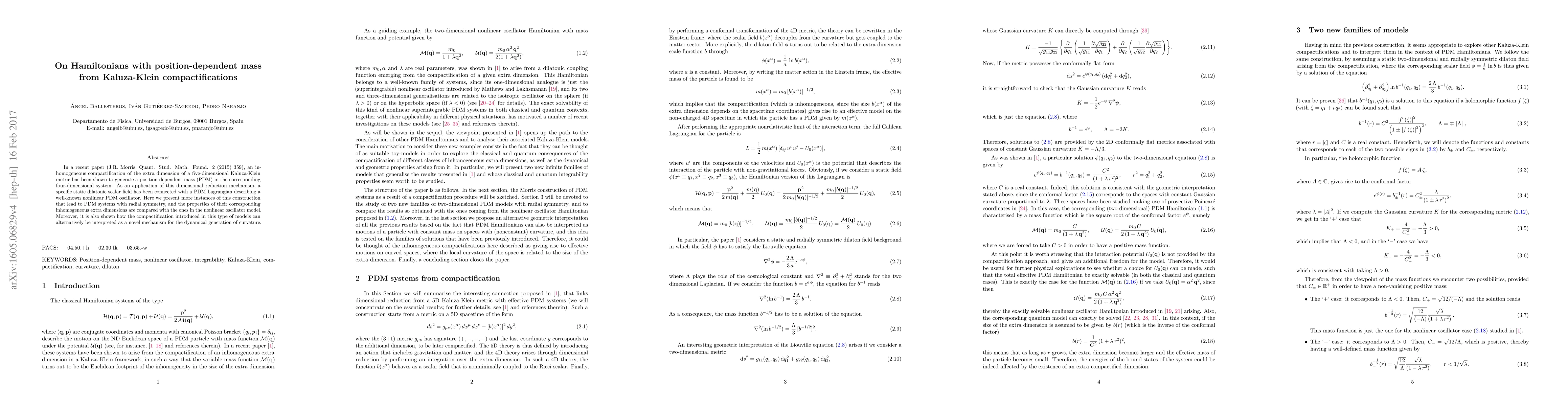 In a recent paper (J.R. Morris, Quant. Stud. Math. Found. 2 (2015) 359), an inhomogeneous compactification of the extra dimension of a five-dimensional Kaluza-Klein metric has been shown to generate a position-dependent mass (PDM) in the corresponding four-dimensional system. As an application of this dimensional reduction mechanism, a specific static dilatonic scalar field has been connected with a PDM Lagrangian describing a well-known nonlinear PDM oscillator. Here we present more instances of this construction that lead to PDM systems with radial symmetry, and the properties of their corresponding inhomogeneous extra dimensions are compared with the ones in the nonlinear oscillator model. Moreover, it is also shown how the compactification introduced in this type of models can alternatively be interpreted as a novel mechanism for the dynamical generation of curvature.
