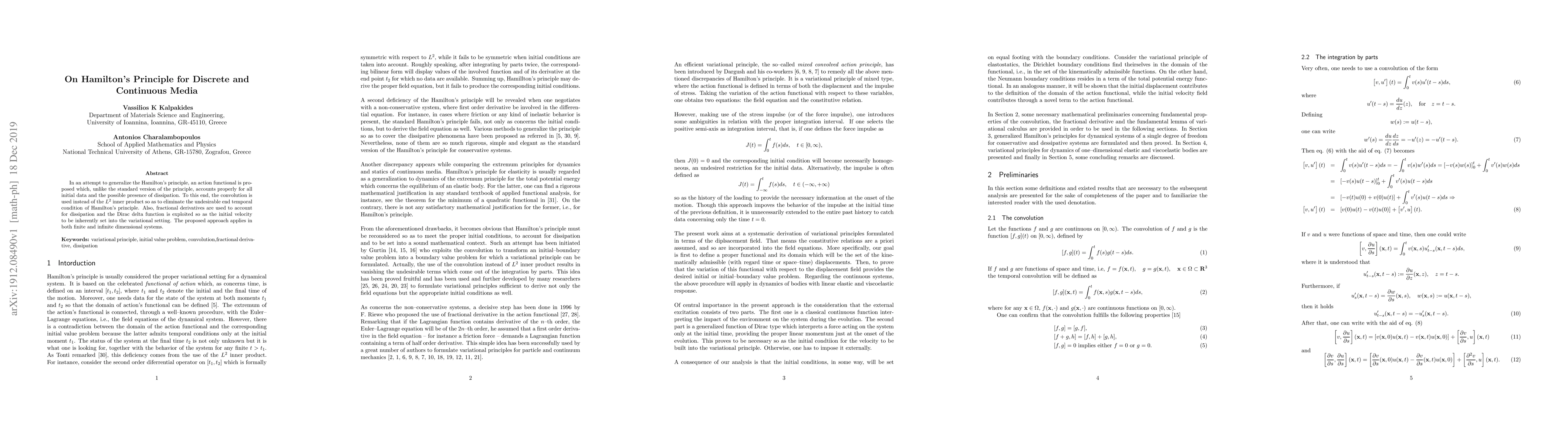 This paper proposes a generalized Hamilton's principle using convolution and fractional derivatives to account for initial data and dissipation, eliminating the end temporal condition. It applies both to discrete and continuous systems.