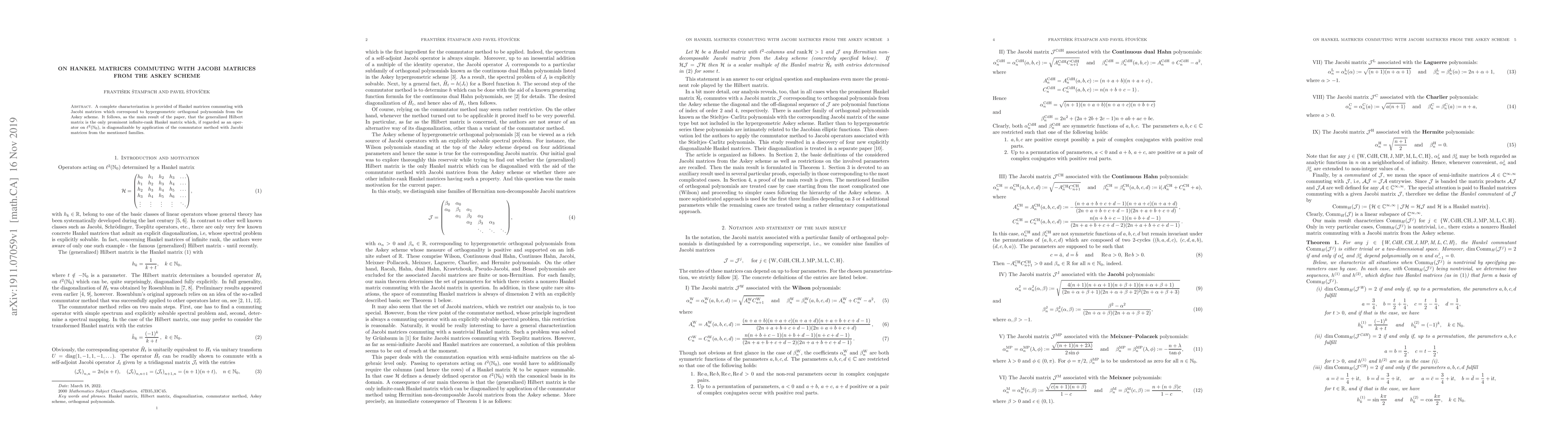 This paper characterizes Hankel matrices commuting with Jacobi matrices linked to hypergeometric orthogonal polynomials in the Askey scheme, concluding that the generalized Hilbert matrix is the only infinite-rank Hankel matrix diagonalizable via the commutator method with these Jacobi matrices.