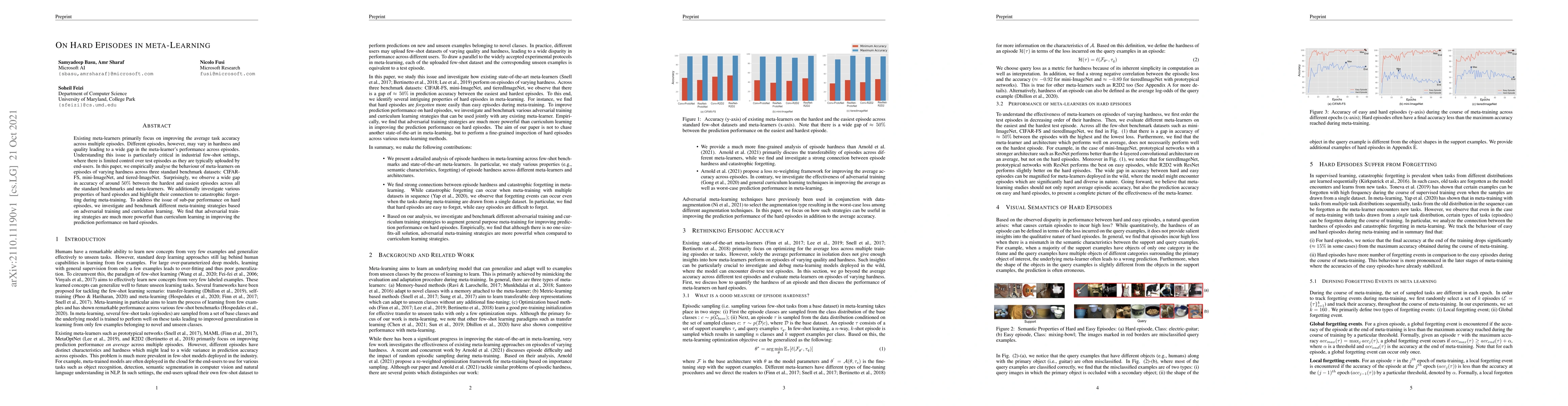 Existing meta-learners primarily focus on improving the average task accuracy across multiple episodes. Different episodes, however, may vary in hardness and quality leading to a wide gap in the meta-learner's performance across episodes. Understanding this issue is particularly critical in industrial few-shot settings, where there is limited control over test episodes as they are typically uploaded by end-users. In this paper, we empirically analyse the behaviour of meta-learners on episodes of varying hardness across three standard benchmark datasets: CIFAR-FS, mini-ImageNet, and tiered-ImageNet. Surprisingly, we observe a wide gap in accuracy of around 50% between the hardest and easiest episodes across all the standard benchmarks and meta-learners. We additionally investigate various properties of hard episodes and highlight their connection to catastrophic forgetting during meta-training. To address the issue of sub-par performance on hard episodes, we investigate and benchmark different meta-training strategies based on adversarial training and curriculum learning. We find that adversarial training strategies are much more powerful than curriculum learning in improving the prediction performance on hard episodes.