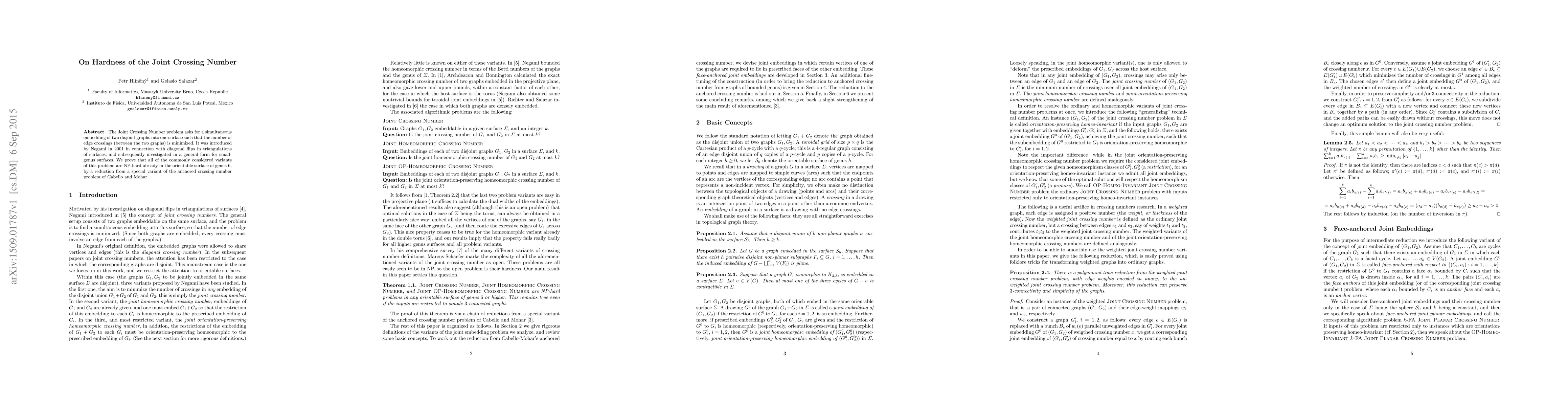 The Joint Crossing Number problem seeks to minimize edge crossings between two disjoint graphs embedded on a single surface. The paper proves that all common variants of this problem are NP-hard, even on orientable surfaces of genus 6, through a reduction from a specialized anchored crossing number problem.