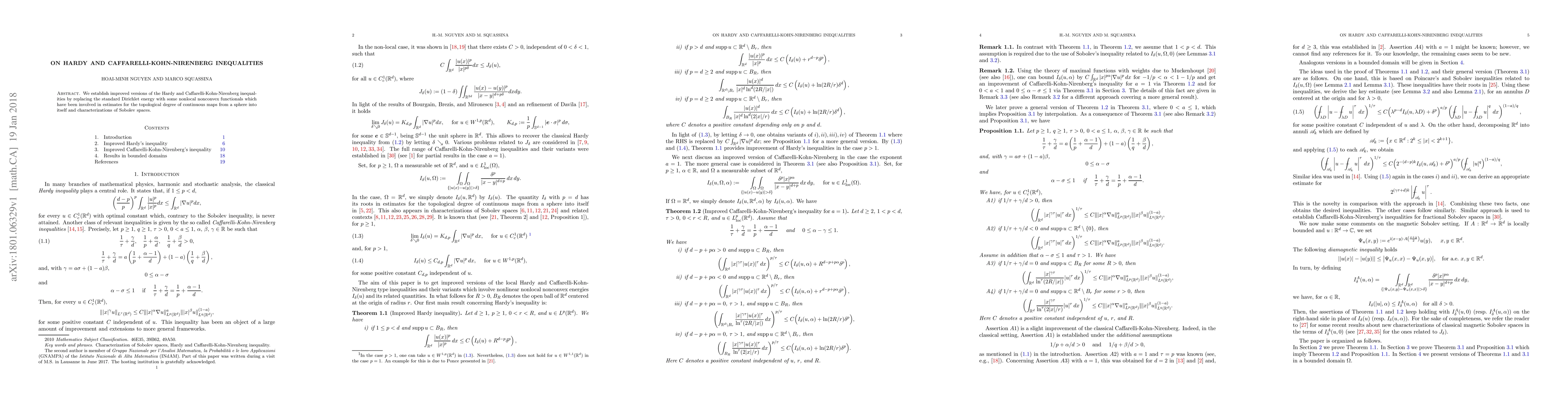 This paper presents enhanced versions of the Hardy and Caffarelli-Kohn-Nirenberg inequalities by substituting the conventional Dirichlet energy with novel nonlocal nonconvex functionals, which are linked to topological degree estimates and the characterization of Sobolev spaces.