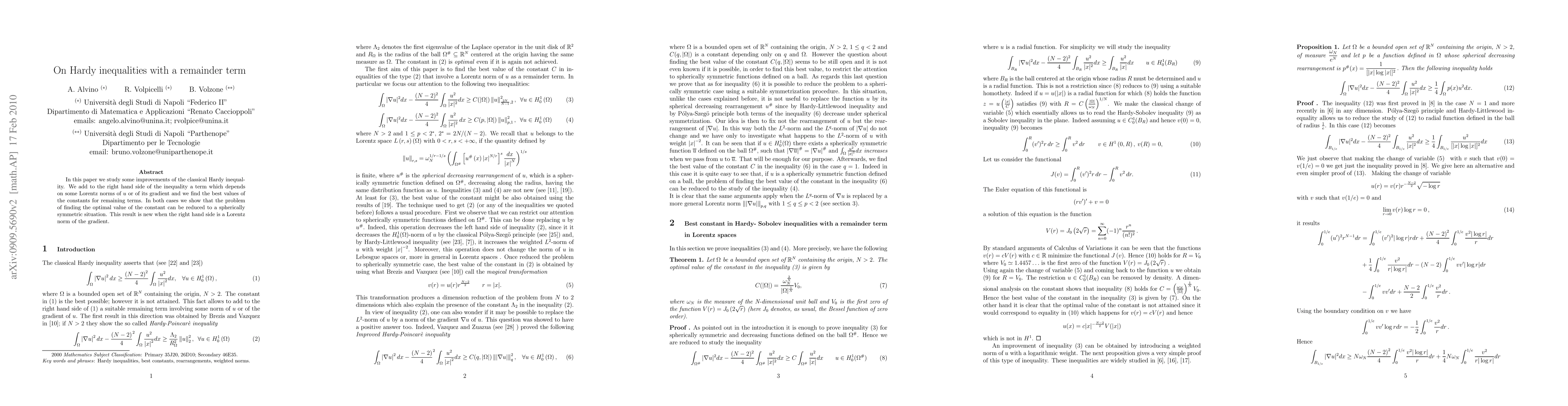 In this paper we study some improvements of the classical Hardy inequality. We add to the right hand side of the inequality a term which depends on some Lorentz norms of $u$ or of its gradient and we find the best values of the constants for remaining terms. In both cases we show that the problem of finding the optimal value of the constant can be reduced to a spherically symmetric situation. This result is new when the right hand side is a Lorentz norm of the gradient.