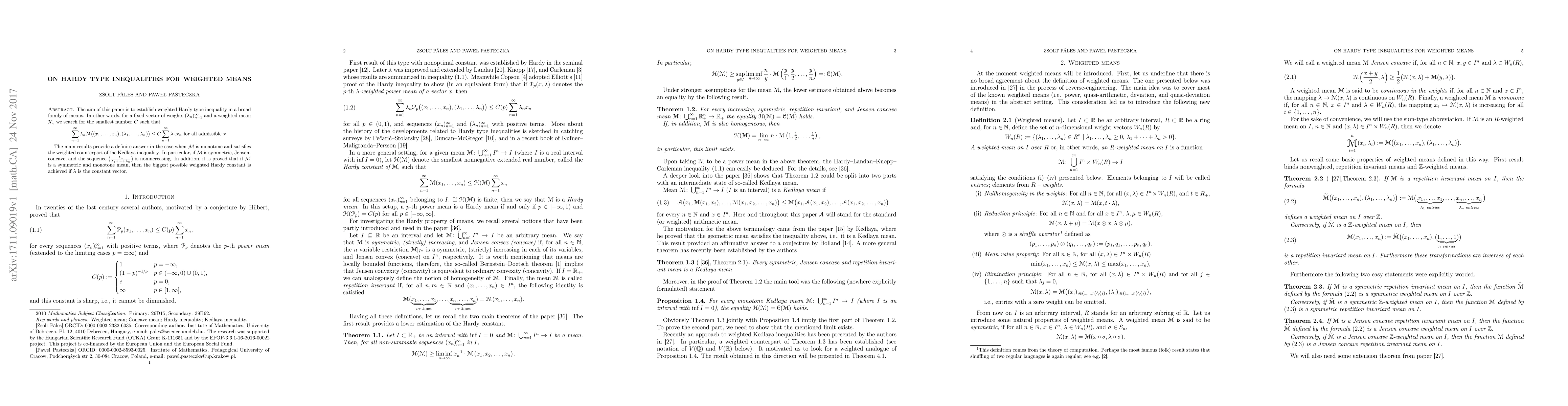The aim of this paper is to establish weighted Hardy type inequality in a broad family of means. In other words, for a fixed vector of weights $(\lambda_n)_{n=1}^\infty$ and a weighted mean $\mathscr{M}$, we search for the smallest number $C$ such that $$\sum_{n=1}^{\infty} \lambda_n \mathscr{M} \big((x_1,\dots,x_n),(\lambda_1,\dots,\lambda_n)\big) \le C \sum_{n=1}^{\infty} \lambda_nx_n \text{ for all admissible }x.$$ The main results provide a definite answer in the case when $\mathcal{M}$ is monotone and satisfies the weighted counterpart of the Kedlaya inequality. In particular, if $\mathcal{M}$ is symmetric, Jensen-concave, and the sequence $\big(\tfrac{\lambda_n}{\lambda_1+\cdots+\lambda_n}\big)$ is nonincreasing. In addition, it is proved that if $\mathcal{M}$ is a symmetric and monotone mean, then the biggest possible weighted Hardy constant is achieved if $\lambda$ is the constant vector.