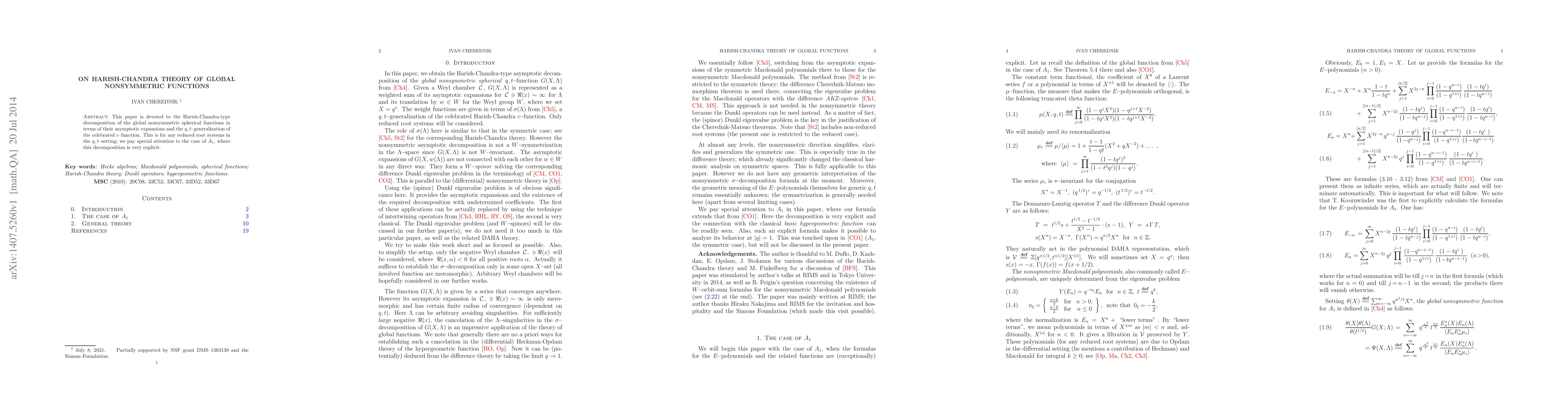 This paper is devoted to the Harish-Chandra-type decomposition of the global nonsymmetric spherical functions in terms of their asymptotic expansions and the q,t-generalization of the celebrated c-function. This is for any reduced root systems in the q,t-setting; we pay special attention to the case of A1, where this decomposition is very explicit.