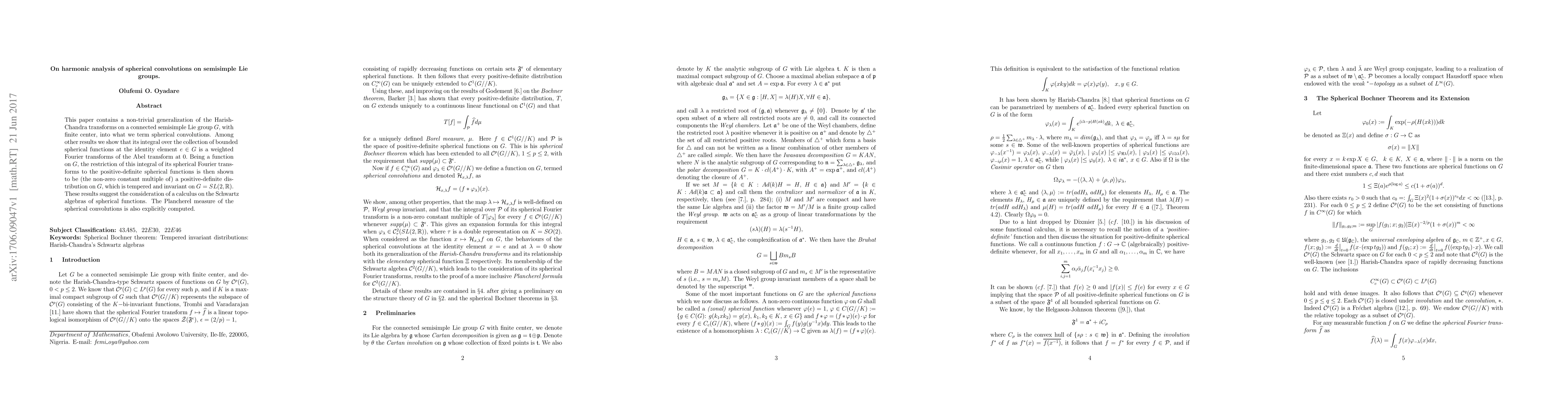 This paper generalizes Harish-Chandra transforms to spherical convolutions on semisimple Lie groups, revealing a weighted Fourier transform relationship and a positive-definite distribution on the group.