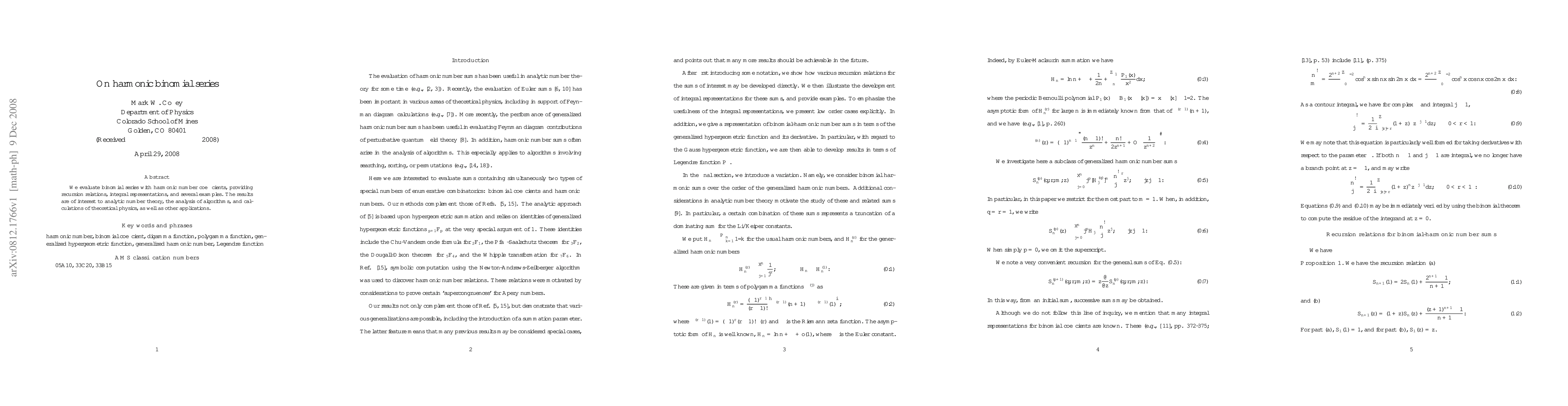 This paper presents evaluations of binomial series with harmonic number coefficients, offering recursion relations, integral representations, and various examples. These findings are significant for analytic number theory, algorithm analysis, theoretical physics, and other fields.