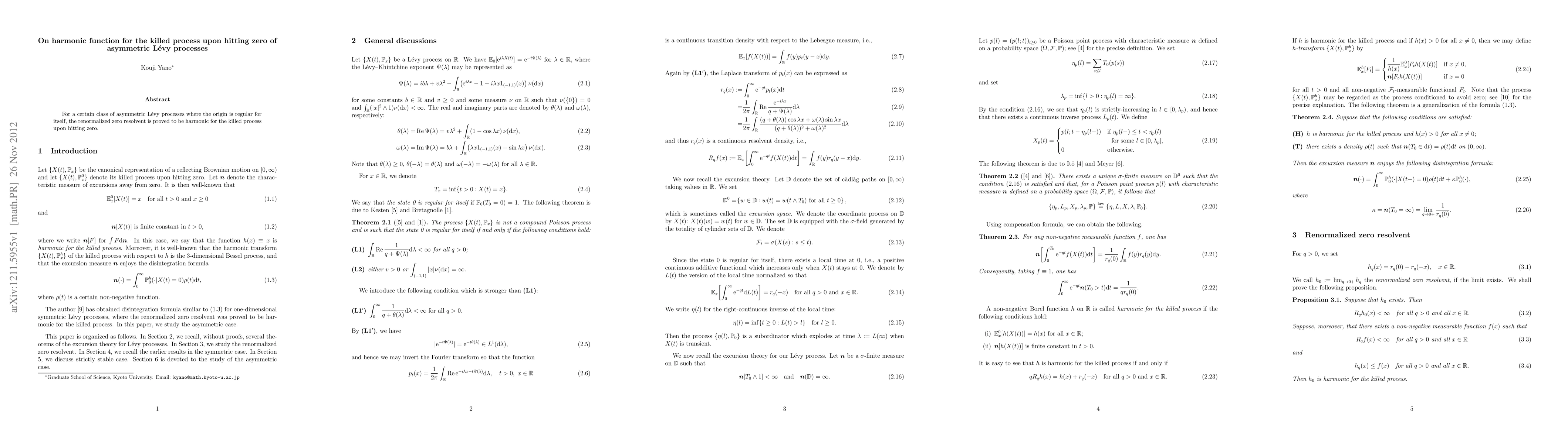 Summary: This paper proves that for asymmetric Lévy processes with the origin as a regular point, the renormalized zero resolvent is harmonic for the killed process upon hitting zero. The result provides insight into the behavior of such processes near the origin.