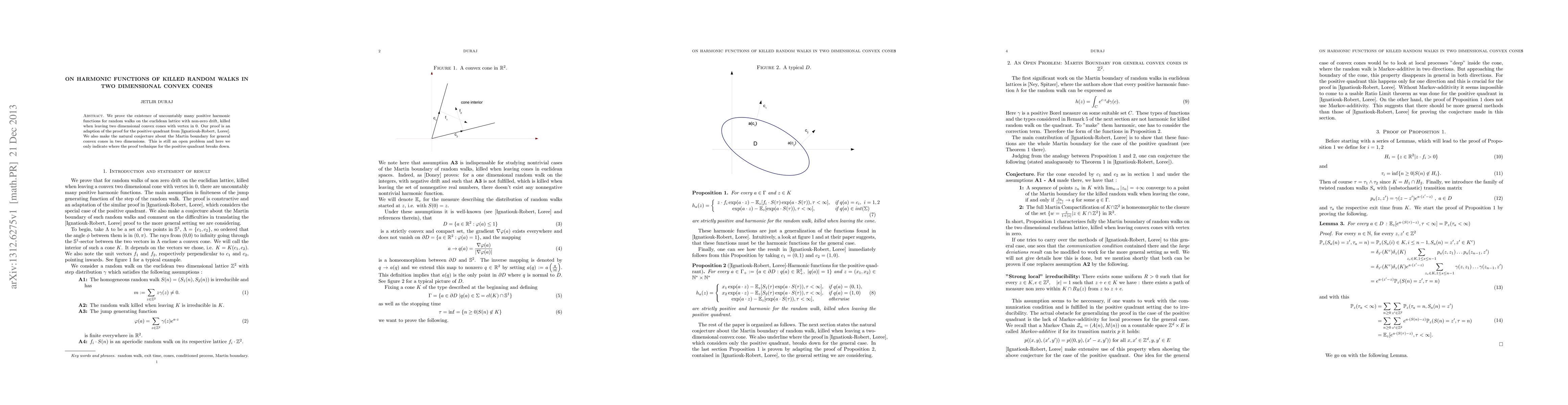 This paper proves the existence of uncountably many positive harmonic functions for random walks in two-dimensional convex cones with a non-zero drift, killed upon exiting the cones. The authors adapt a known proof technique from the positive quadrant and propose a conjecture regarding the Martin boundary for general convex cones.