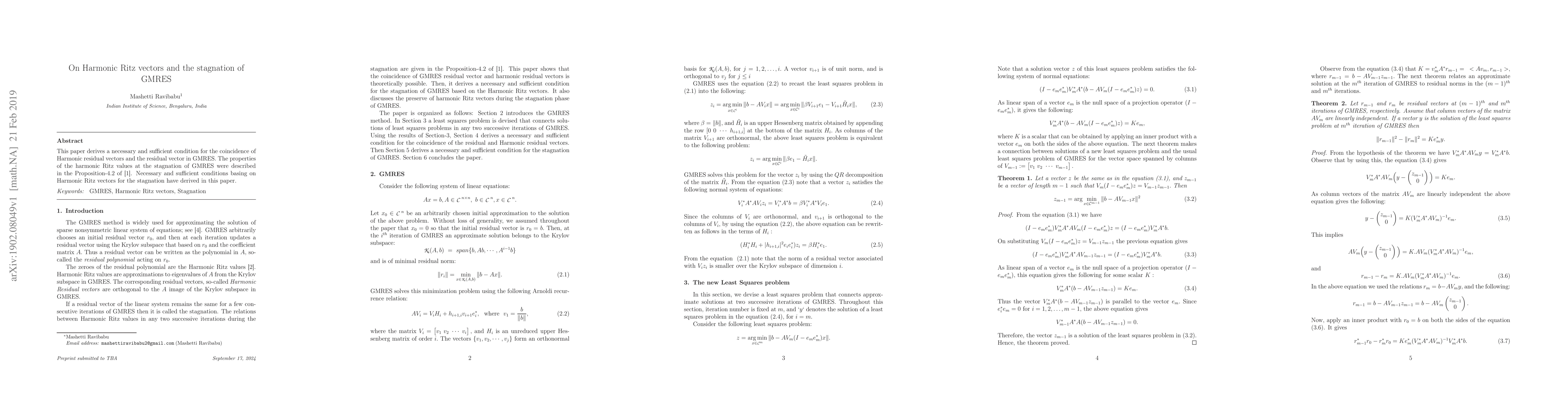 This paper derives a necessary and sufficient condition for the coincidence of Harmonic residual vectors and the residual vector in GMRES. The properties of the harmonic Ritz values at the stagnation of GMRES were described in the Proposition-4.2 of [1]. Necessary and sufficient conditions basing on Harmonic Ritz vectors for the stagnation have derived in this paper.