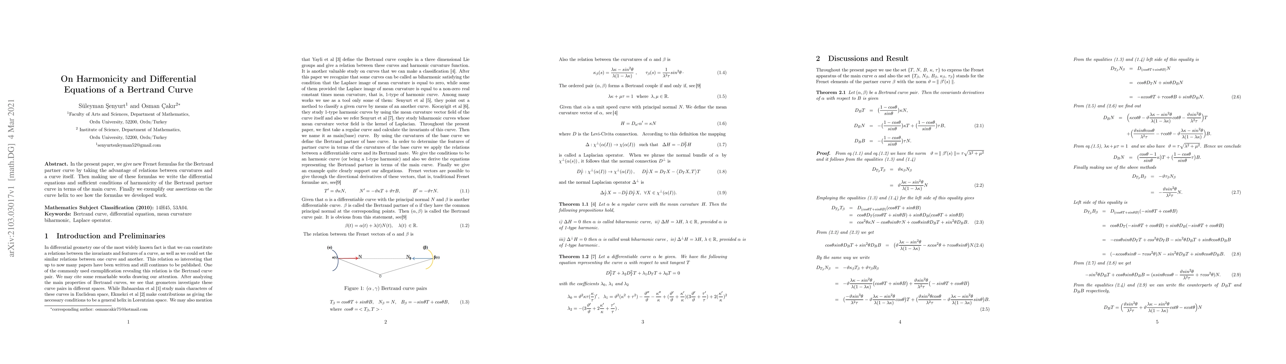 In the present paper, we give new Frenet formulas for the Bertrand partner curve by taking the advantage of relations between curvatures and a curve itself. Then making use of these formulas we write the differential equations and sufficient conditions of harmonicity of the Bertrand partner curve in terms of the main curve. Finally, we exemplify our assertions on the curve helix to see how the formulas we developed work.