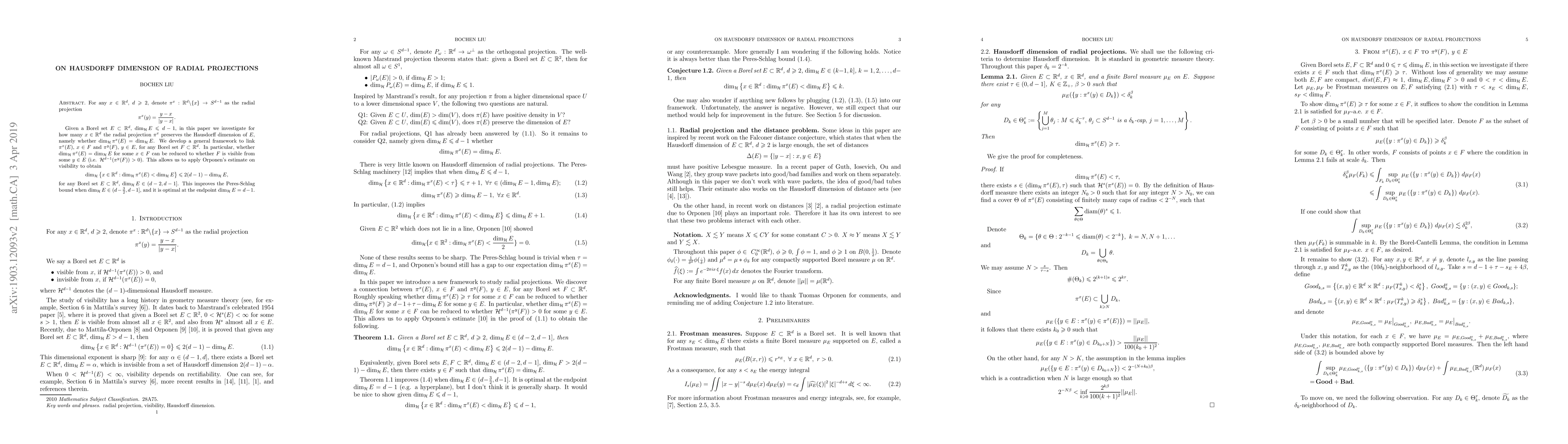For any $x\in\mathbb{R}^d$, $d\geq 2$, denote $\pi^x: \mathbb{R}^d\backslash\{x\}\rightarrow S^{d-1}$ as the radial projection $$\pi^x(y)=\frac{y-x}{|y-x|}. $$ Given a Borel set $E\subset{\Bbb R}^d$, $\dim_{\mathcal{H}} E\leq d-1$, in this paper we investigate for how many $x\in \mathbb{R}^d$ the radial projection $\pi^x$ preserves the Hausdorff dimension of $E$, namely whether $\dim_{\mathcal{H}}\pi^x(E)=\dim_{\mathcal{H}} E$. We develop a general framework to link $\pi^x(E)$, $x\in F$ and $\pi^y(F)$, $y\in E$, for any Borel set $F\subset\mathbb{R}^d$. In particular, whether $\dim_{\mathcal{H}}\pi^x(E)=\dim_{\mathcal{H}}E$ for some $x\in F$ can be reduced to whether $F$ is visible from some $y\in E$ (i.e. $\mathcal{H}^{d-1}(\pi^y(F))>0$). This allows us to apply Orponen's estimate on visibility to obtain $$\dim_{\mathcal{H}}\left\{x\in\mathbb{R}^d: \dim_{\mathcal{H}}\pi^x(E)<\dim_{\mathcal{H}}E\right\}\leq 2(d-1)-\dim_{\mathcal{H}}E,$$ for any Borel set $E\subset{\Bbb R}^d$, $\dim_{\mathcal{H}} E\in(d-2, d-1]$. This improves the Peres-Schlag bound when $\dim_{\mathcal{H}} E\in(d-\frac{3}{2}, d-1]$, and it is optimal at the endpoint $\dim_{\mathcal{H}} E=d-1$.