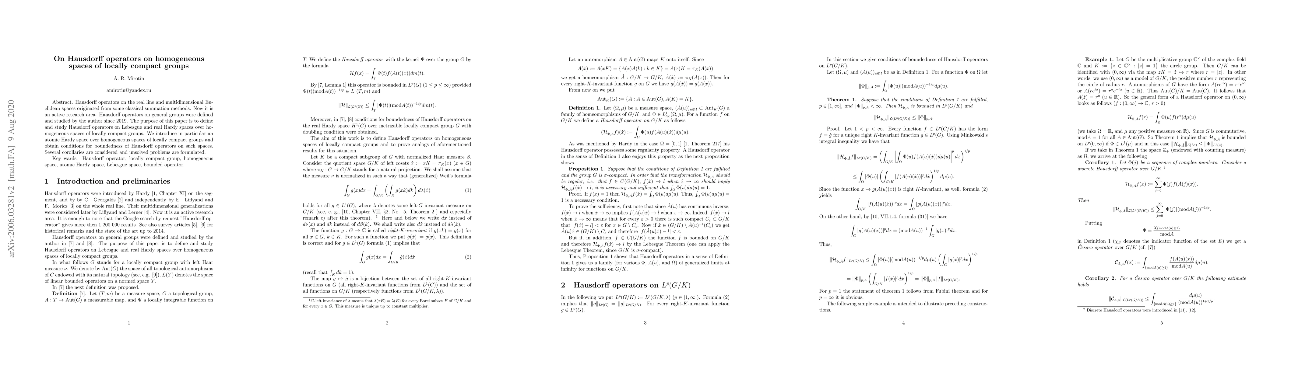 This paper defines and investigates Hausdorff operators on Lebesgue and real Hardy spaces over homogeneous spaces of locally compact groups, introducing an atomic Hardy space and establishing conditions for their boundedness, while also presenting corollaries and outlining unsolved problems in the field.