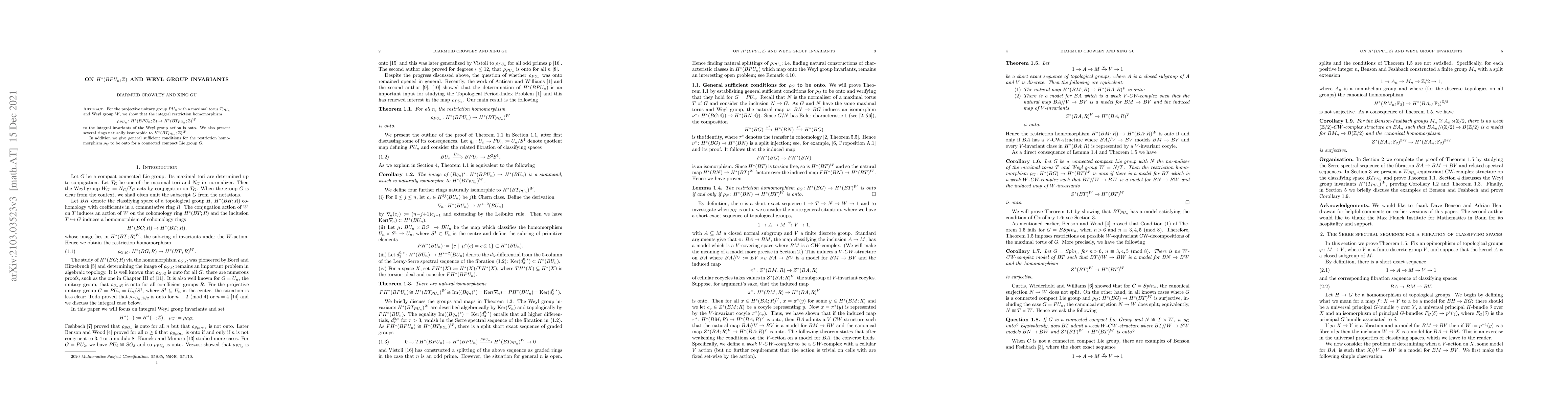 This paper demonstrates that the integral restriction homomorphism from the cohomology of the classifying space of the projective unitary group $PU_n$ to the Weyl group invariants is onto. It also identifies several isomorphic rings to these invariants and provides general conditions for similar homomorphisms in other connected compact Lie groups.