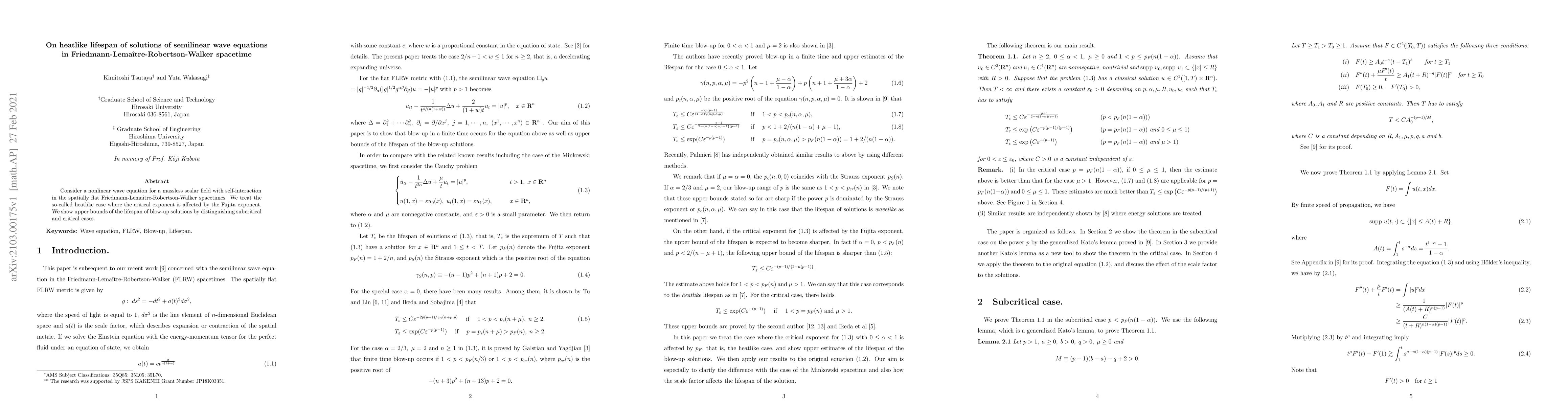 Consider a nonlinear wave equation for a massless scalar field with self-interaction in the spatially flat Friedmann-Lema\^{i}tre-Robertson-Walker spacetimes. We treat the so-called heatlike case where the critical exponent is affected by the Fujita exponent. We show upper bounds of the lifespan of blow-up solutions by distinguishing subcritical and critical cases.