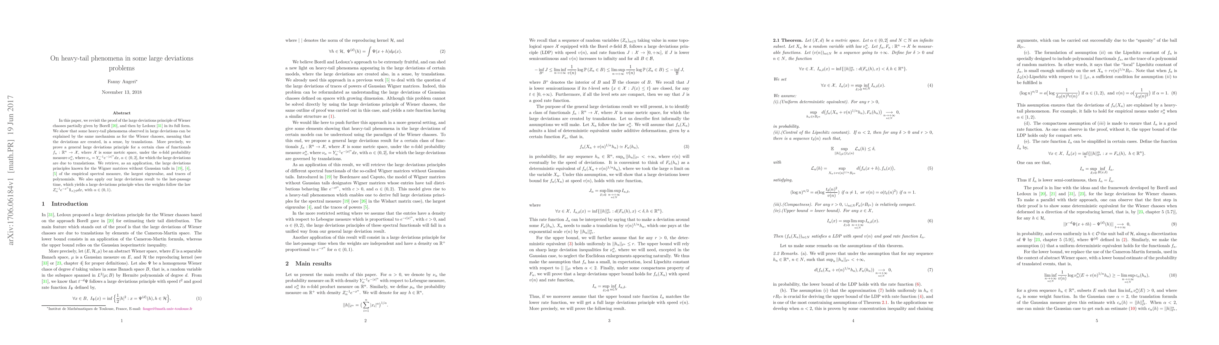In this paper, we revisit the proof of the large deviations principle of Wiener chaoses partially given by Borel, and then by Ledoux in its full form. We show that some heavy-tail phenomena observed in large deviations can be explained by the same mechanism as for the Wiener chaoses, meaning that the deviations are created, in a sense, by translations. More precisely, we prove a general large deviations principle for a certain class of functionals $f_n : \mathbb{R}^n \to \mathcal{X}$, where $\mathcal{X}$ is some metric space, under the $n$-fold probability measure $\nu_{\alpha}^n$, where $\nu_{\alpha} =Y_{\alpha}^{-1}e^{-|x|^{\alpha}}dx$, $\alpha \in (0,2]$, for which the large deviations are due to translations. We retrieve, as an application, the large deviations principles known for the Wigner matrices without Gaussian tails, of the empirical spectral measure by Bordenave and Caputo, the largest eigenvalue and traces of polynomials by the author. We also apply our large deviations result to the last-passage time, which yields a large deviations principle when the weights have the density $Z_{\alpha}^{-1} e^{-x^{\alpha}}$ with respect to Lebesgue measure on $\mathbb{R}_+$, with $\alpha \in (0,1)$.